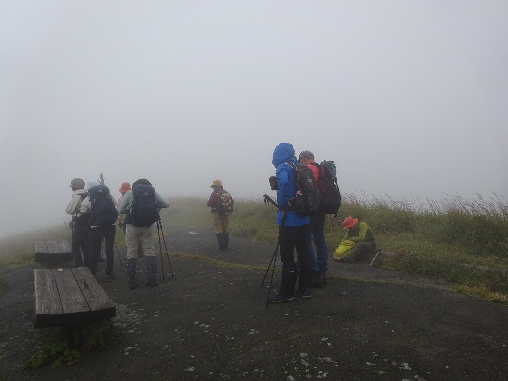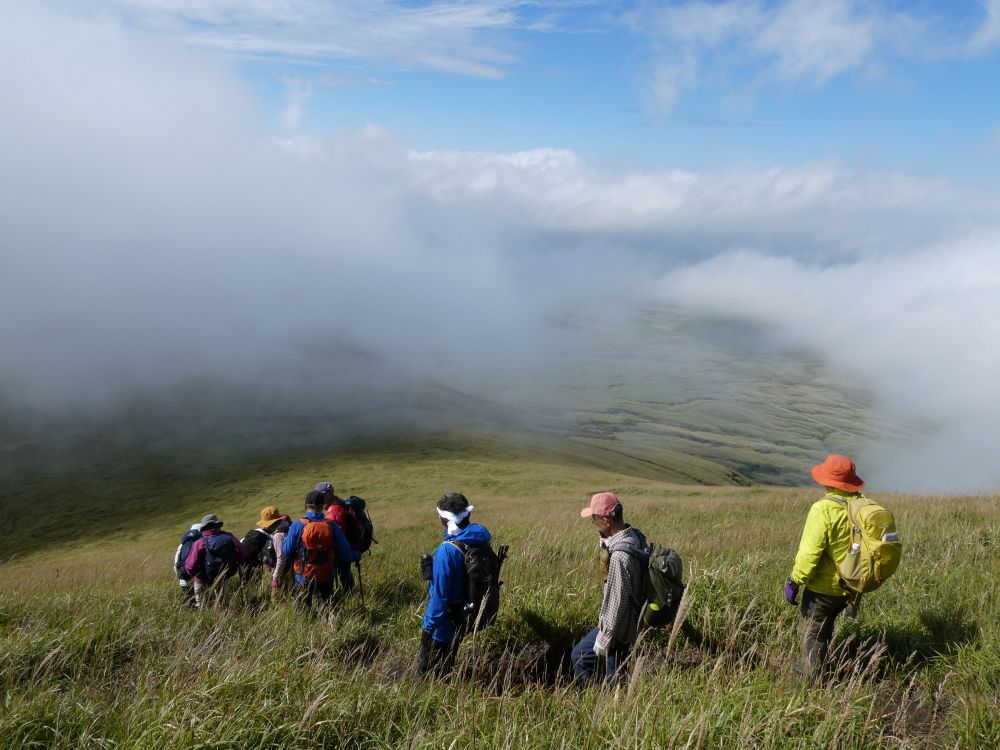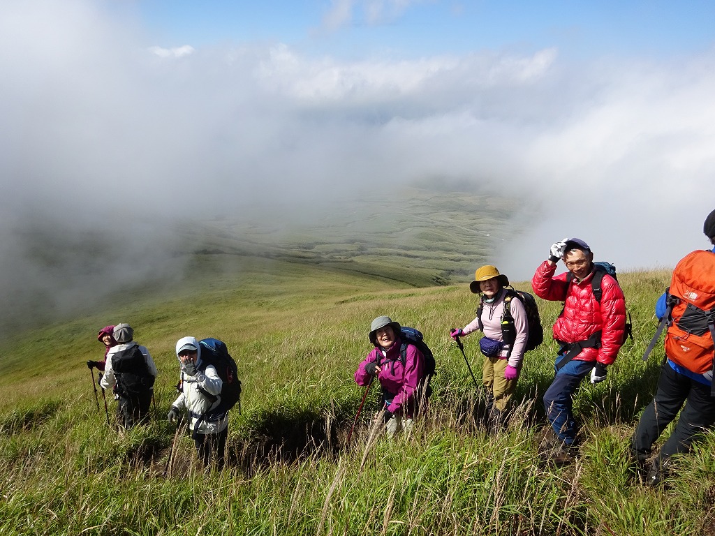 前半はガスガス真っ白で道迷いするのではないかと不安になるくらいの天気でしたが、後半は青空が広がり阿蘇の山並みを一望することができました。