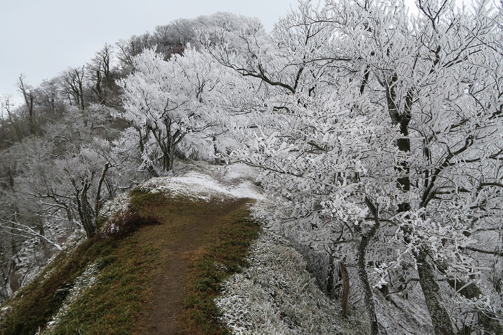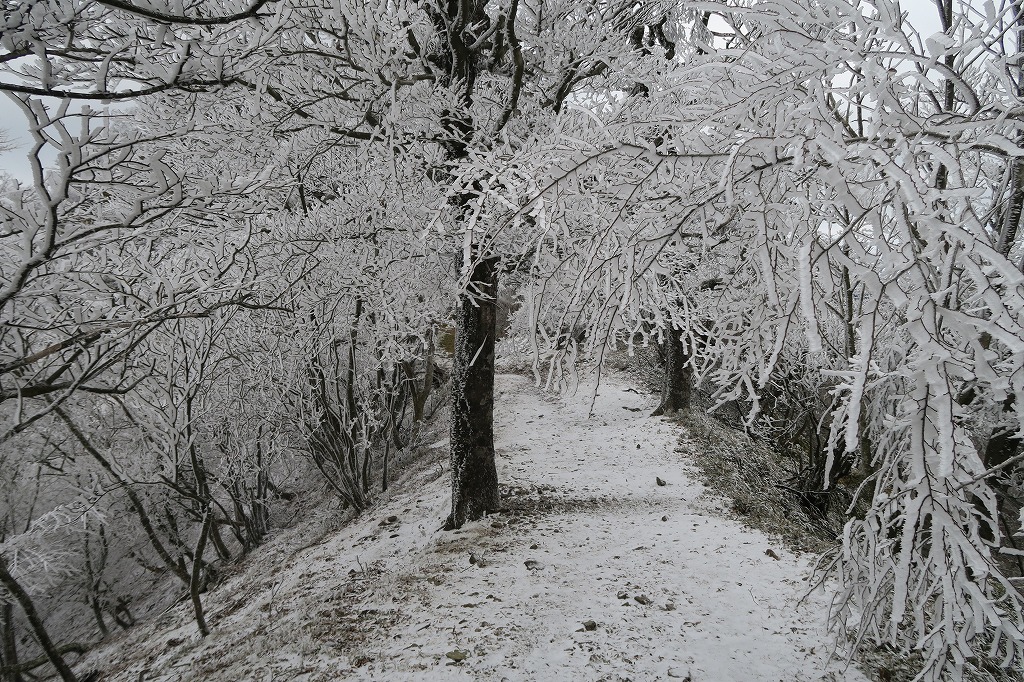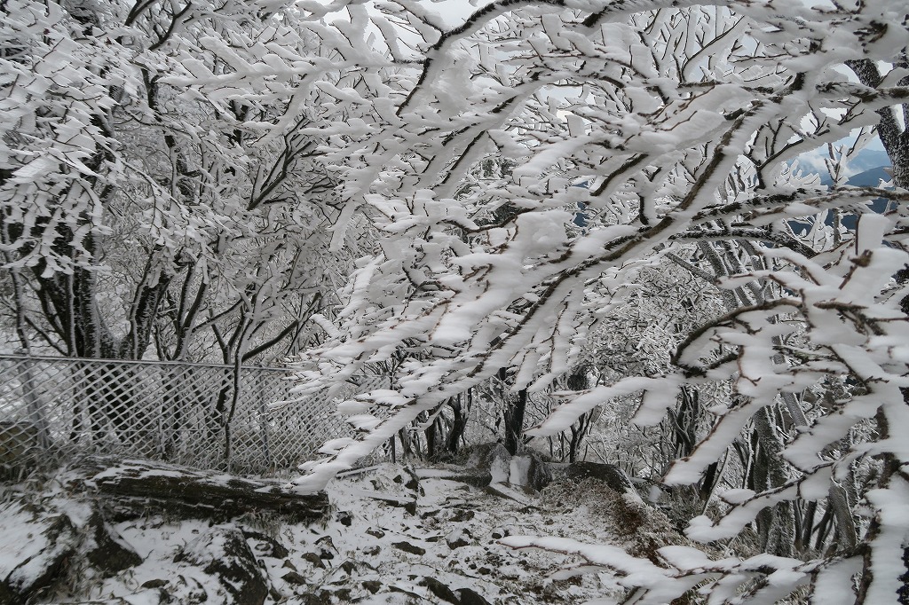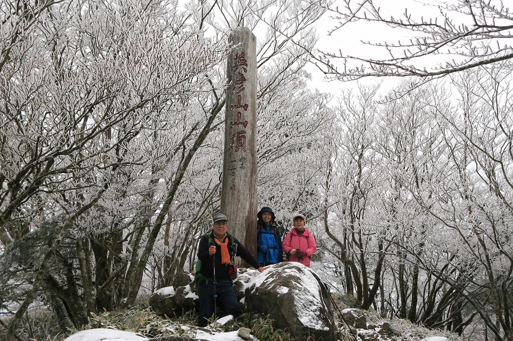 登り始めからうっすらと雪が積もっており、山頂付近はかなりの長さの「エビのしっぽ」のついた霧氷が見られました。