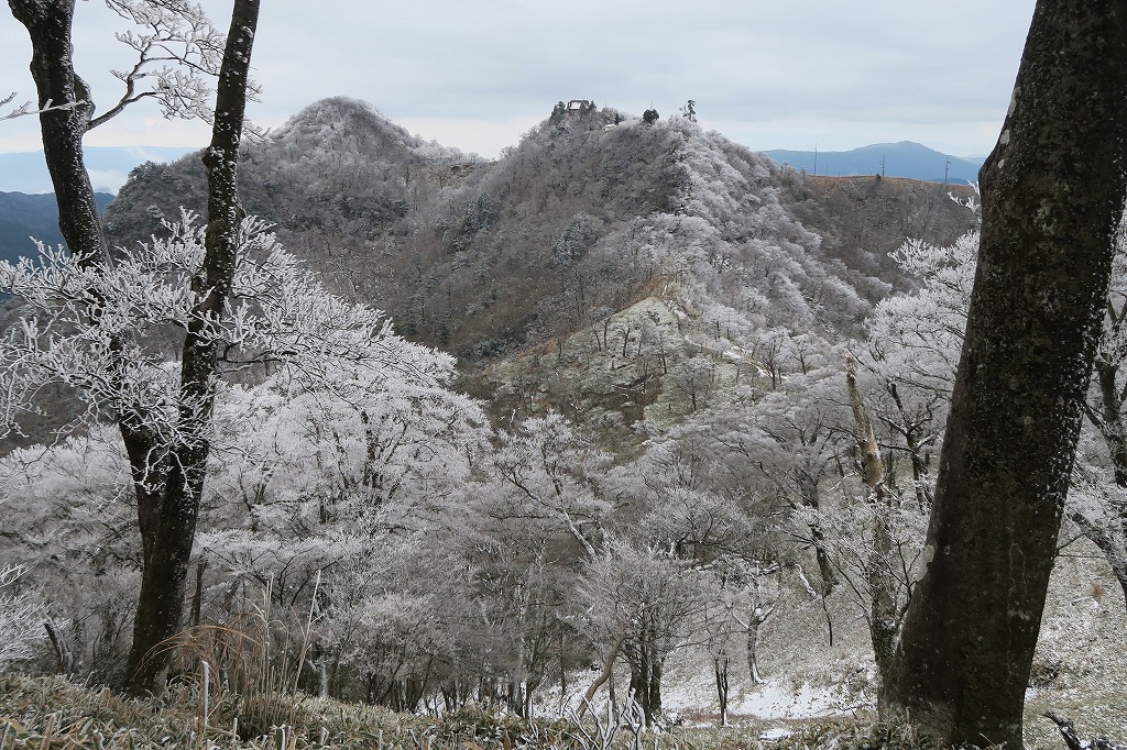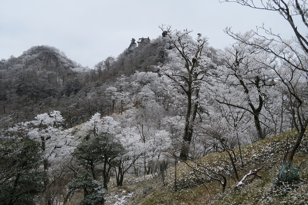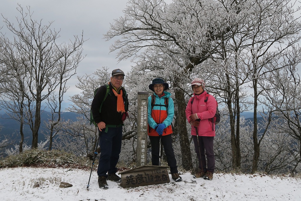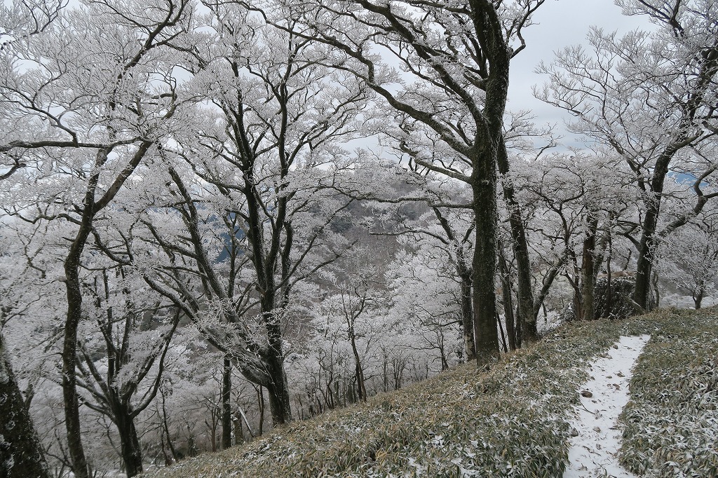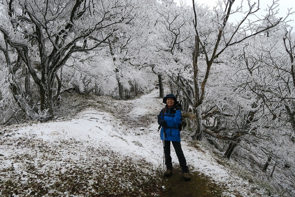登り始めからうっすらと雪が積もっており、山頂付近はかなりの長さの「エビのしっぽ」のついた霧氷が見られました。