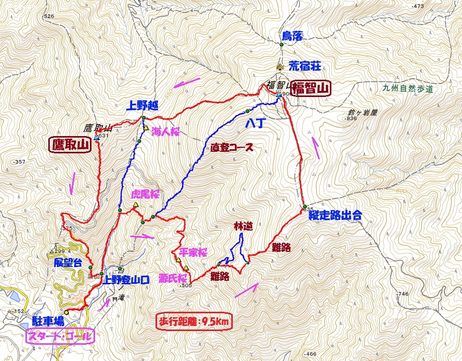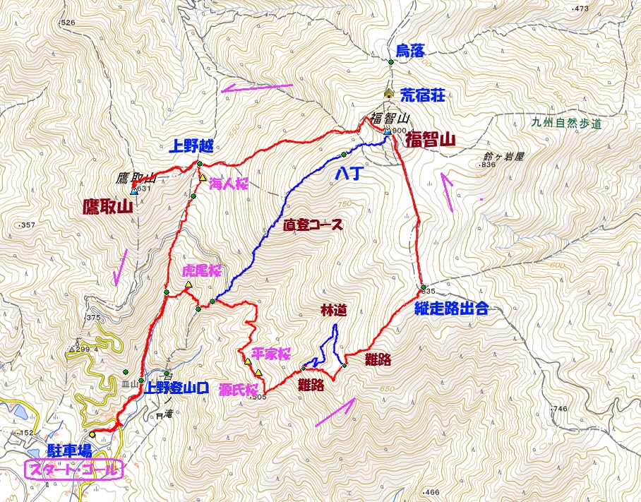 上野登山口より{虎尾桜〜平家桜〜源氏桜}と「桜めぐり」をした後 斜面を福智山縦走路に直接登り上がります。