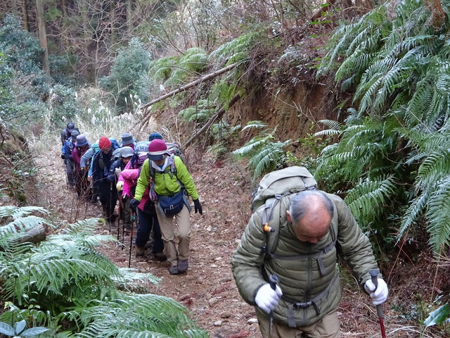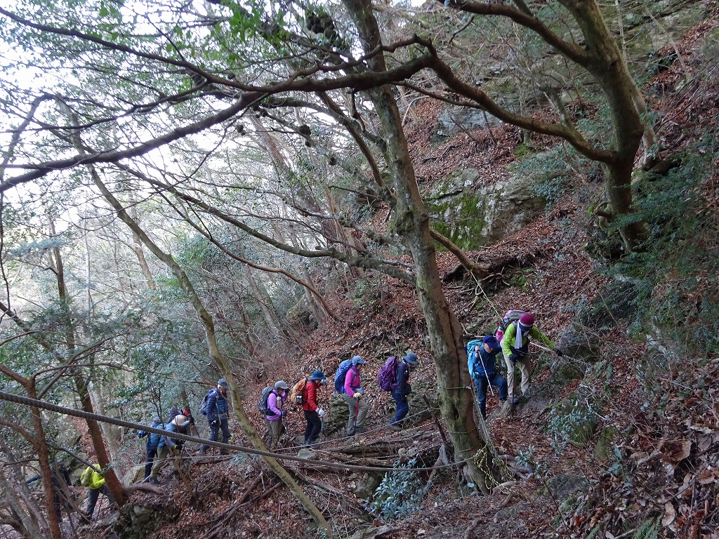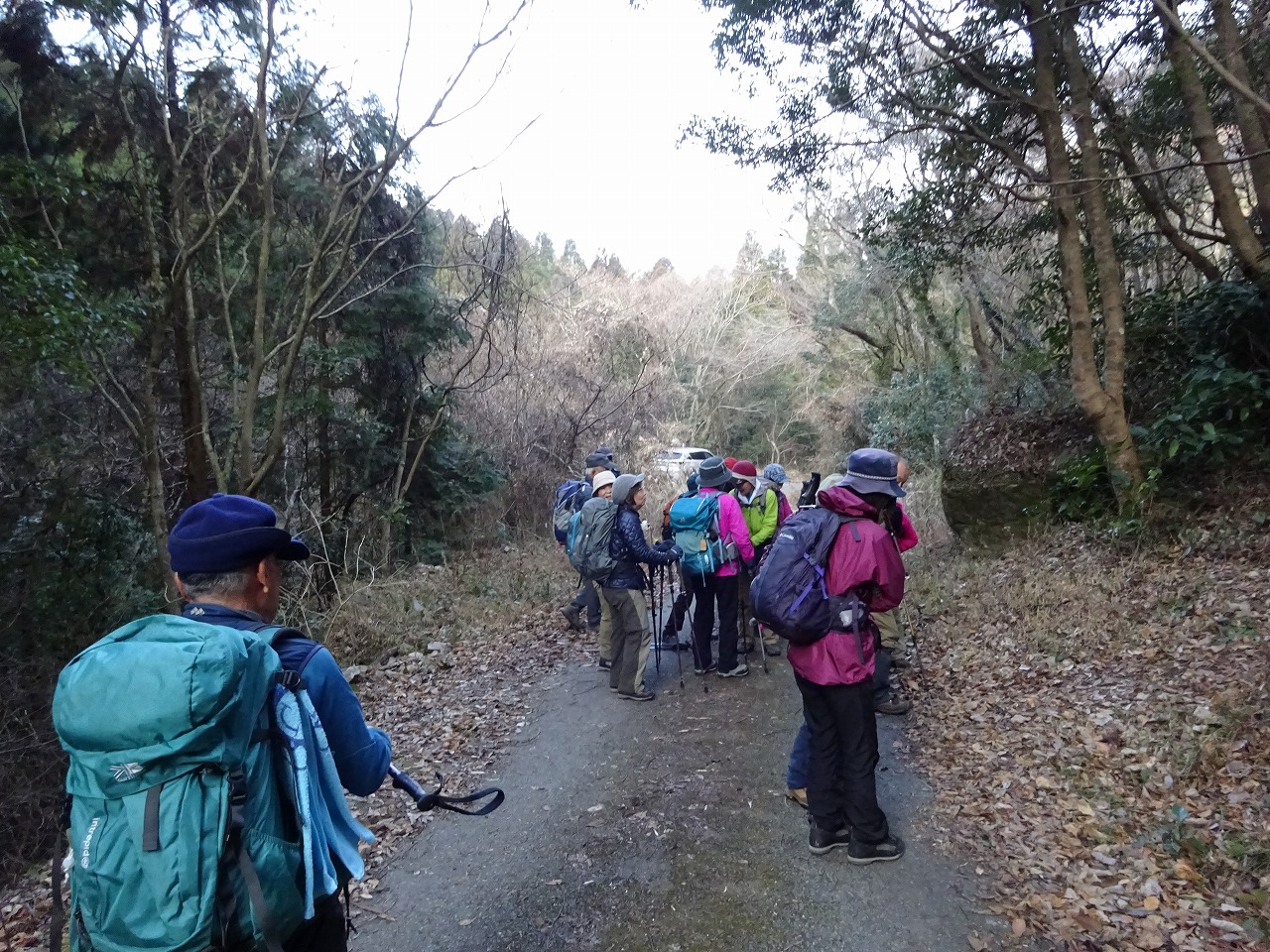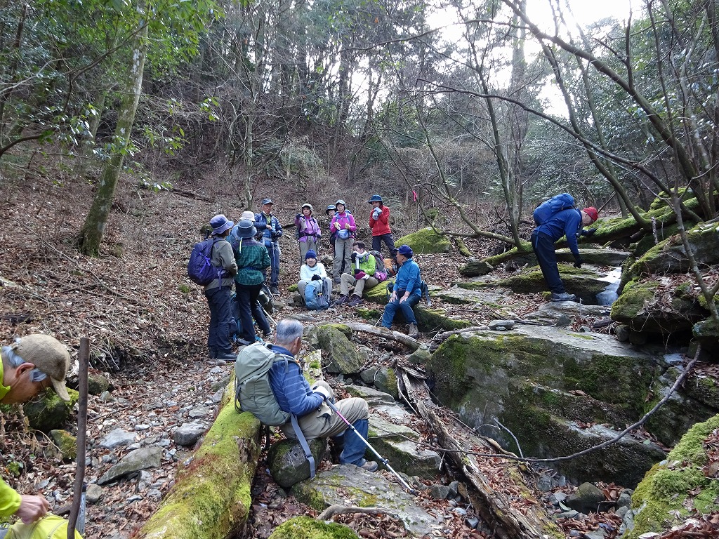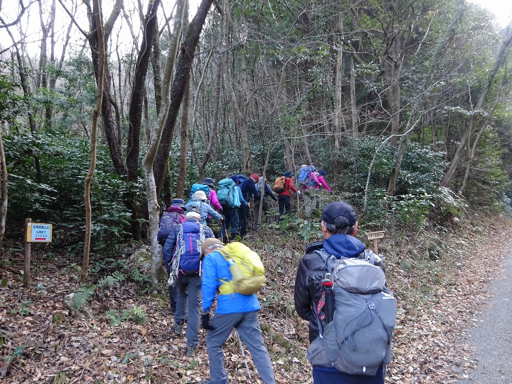 1月21日(火)車4台16名での平日山行です。矢谷渓谷キャンプ場を経、2ヶ所目の養魚場手前から林道へ入り、矢谷橋登山口に車を停めて、少々戻った北尾根登山口から出発。