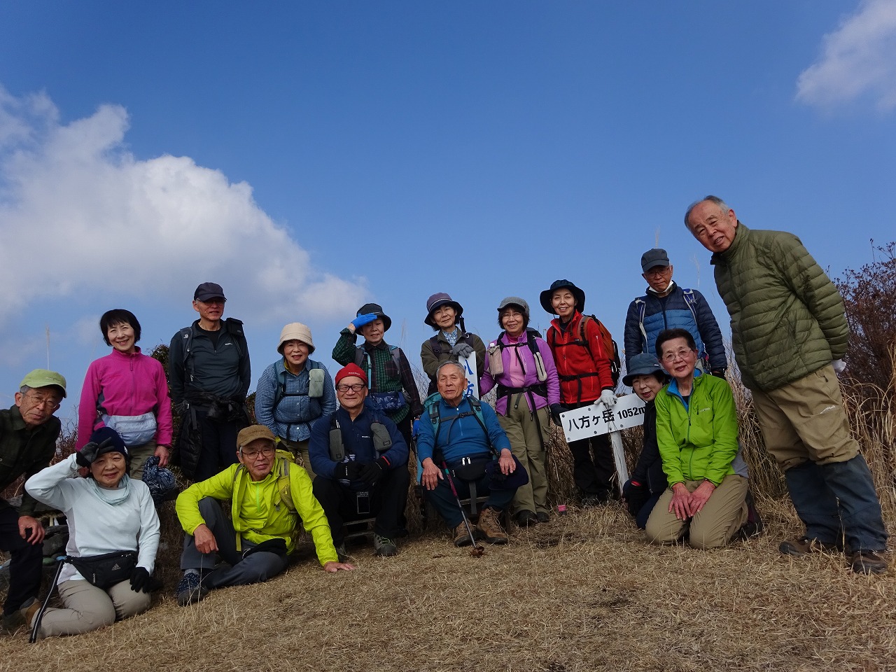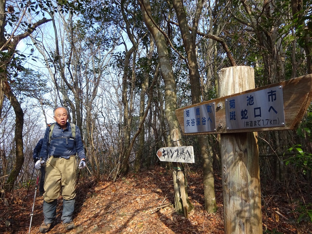 ・この表示、干支の巳(蛇)がみえる、まさかそれを意識して八方ヶ岳にしたとか?山頂手前の菊池方面「班蛇口(はんじゃく)」への分岐・山頂は16名独占昼食、この後、山の神分岐から林道出合、林道を経由してもどる。