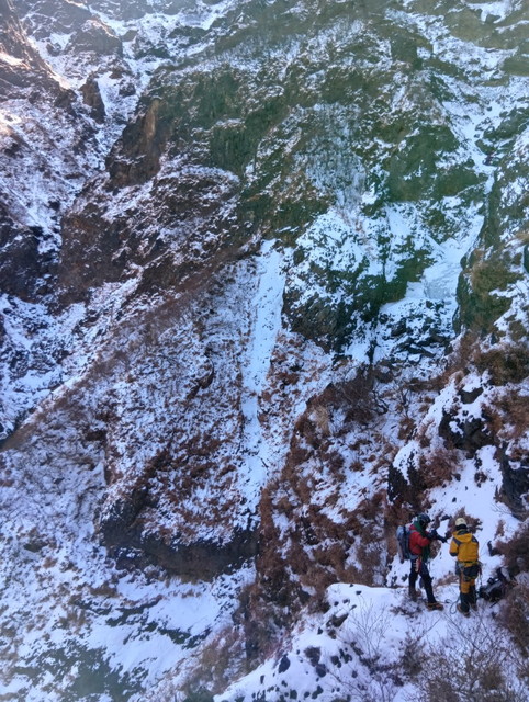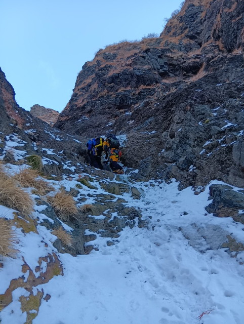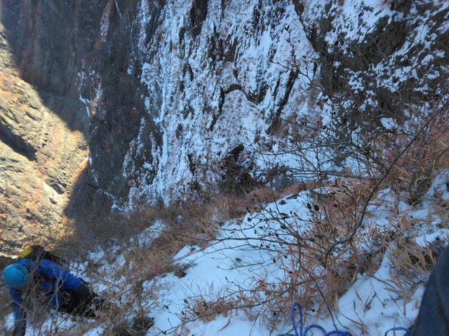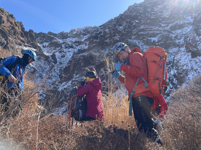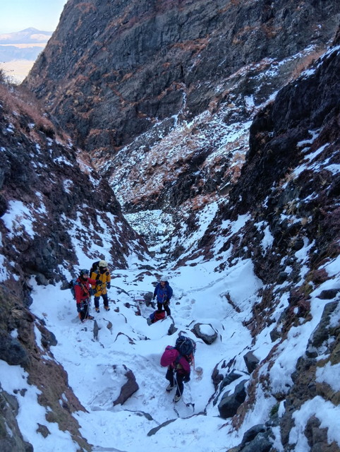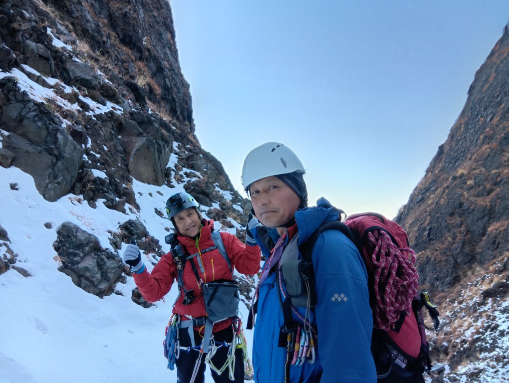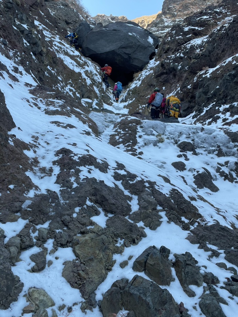 関門でハーネス、アイゼン装着し、赤谷に入りましたが、チョックストーンは超えられたものの、その次の滝はほとんど氷が無くツルツルの表面、左側(右岸)は脆くて崩れやすい岩層。右側(左岸)も手がかり足がかりがない壁をT尾さんが苦労しながらリードしてくれましたが、厳し過ぎたため赤谷には戻らず、ここで脱渓となりました。