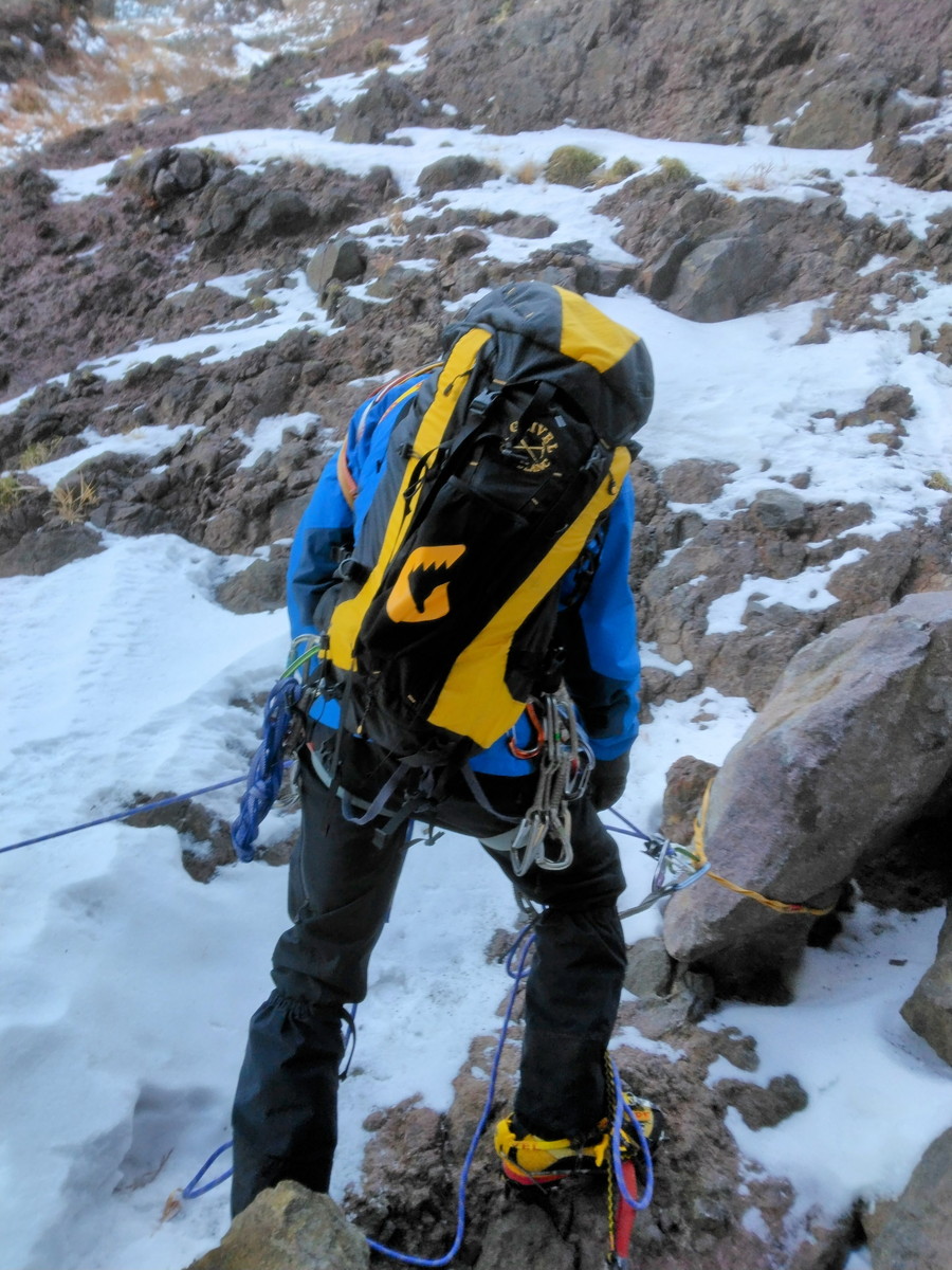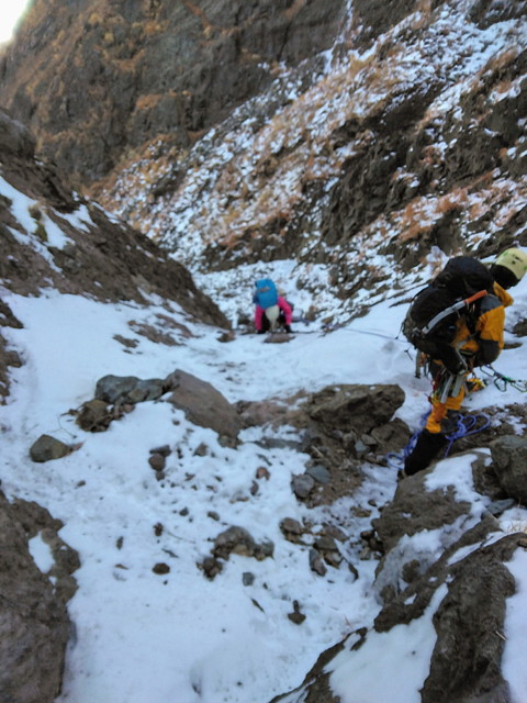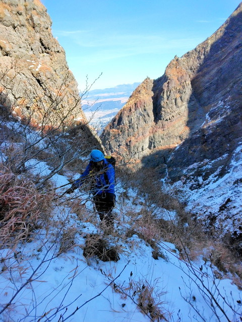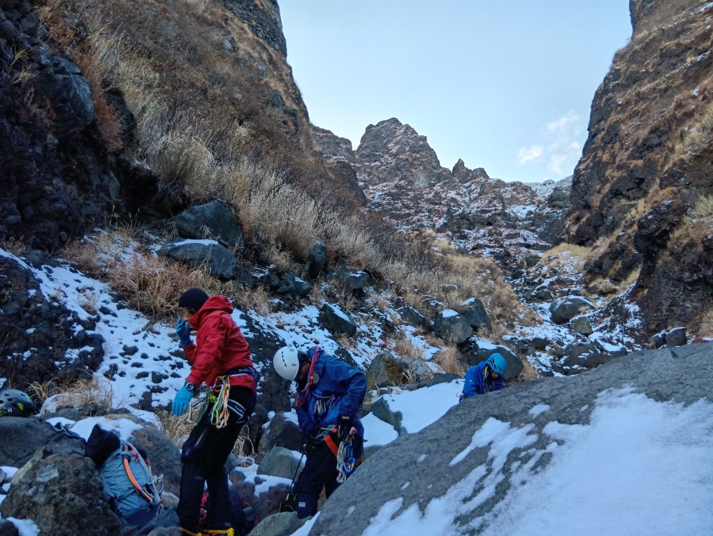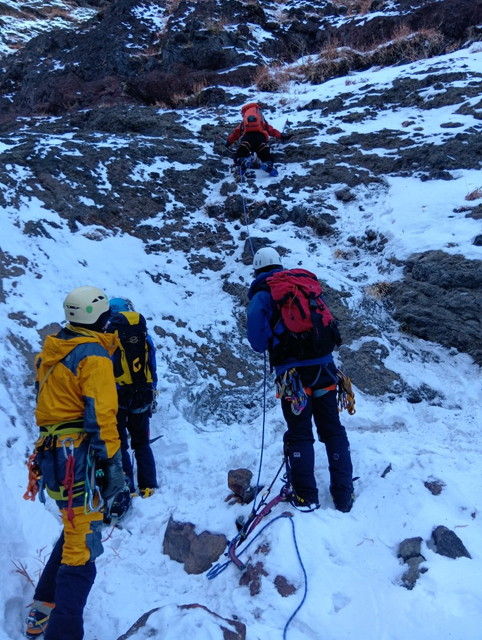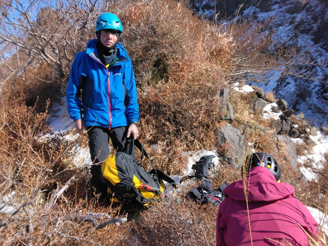 関門でハーネス、アイゼン装着し、赤谷に入りましたが、チョックストーンは超えられたものの、その次の滝はほとんど氷が無くツルツルの表面、左側(右岸)は脆くて崩れやすい岩層。右側(左岸)も手がかり足がかりがない壁をT尾さんが苦労しながらリードしてくれましたが、厳し過ぎたため赤谷には戻らず、ここで脱渓となりました。