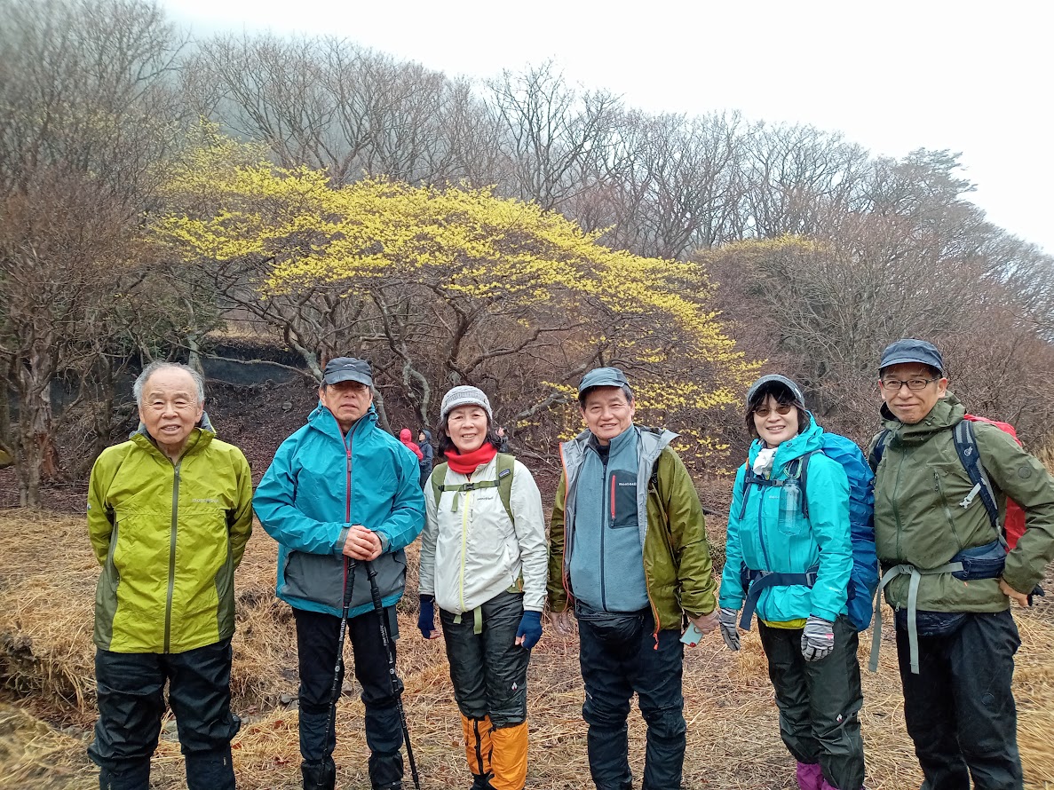 満開のマンサクをバックに集合写真