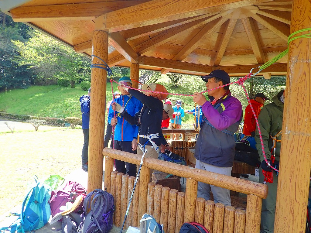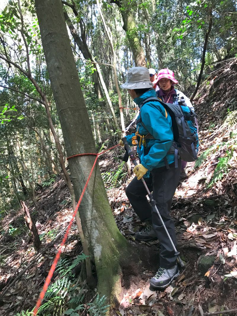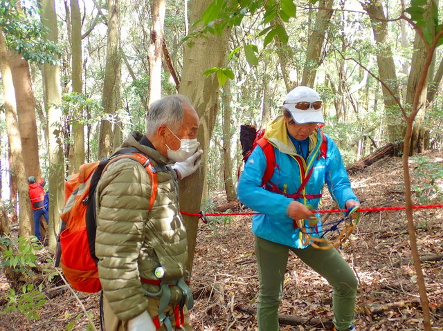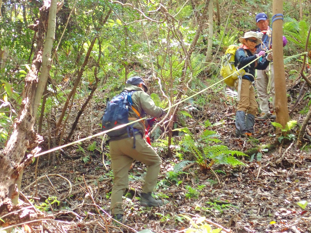 山に入って4班に分かれて実習 トップがロープを張ってセカンドサードが通過、ラスト前の人はラストの人が回収しやすくしてラストはスリング・カラビナ回収しながら登ってくる