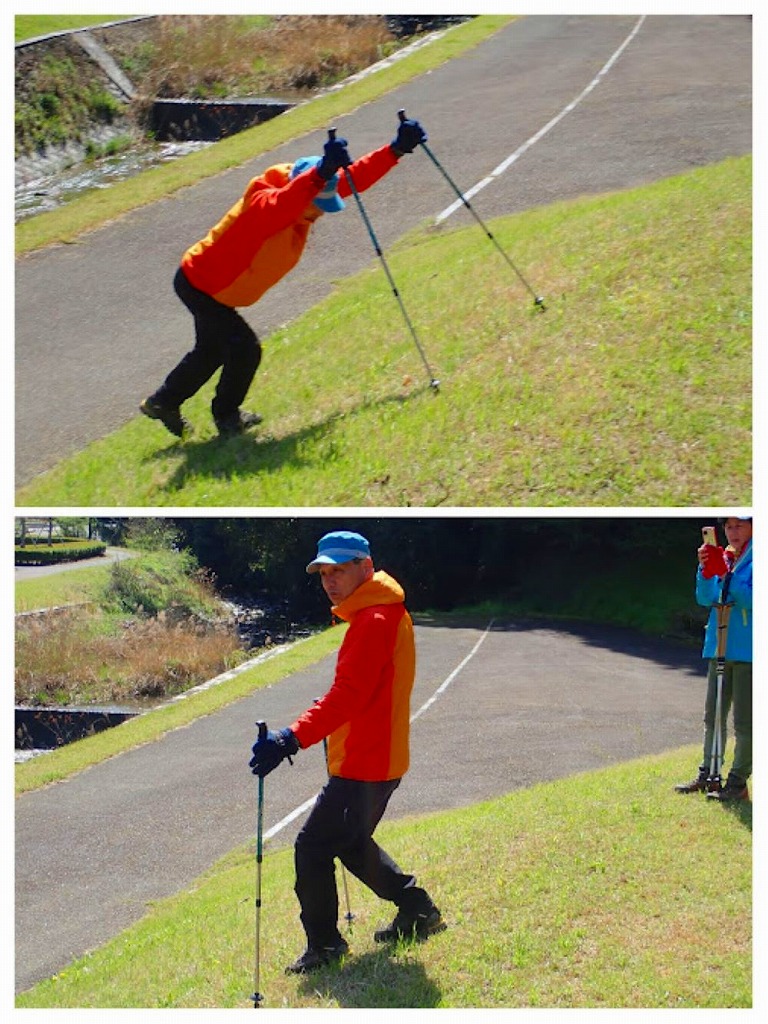 斜面を使ってストック(ポール)のいい姿勢・悪い姿勢