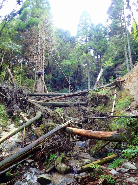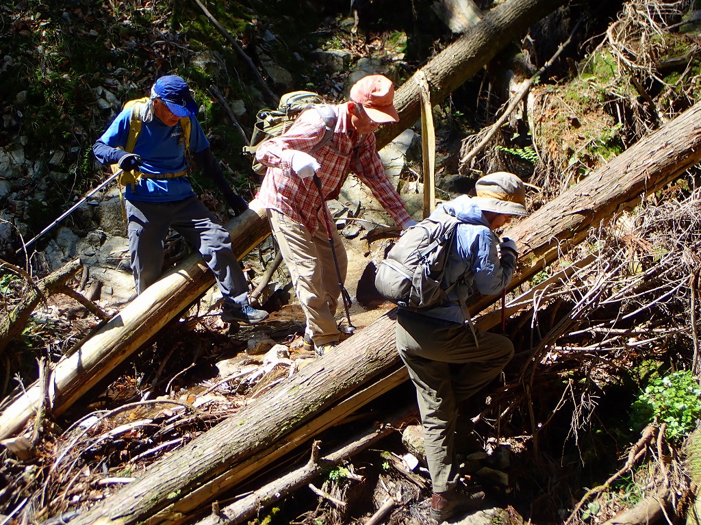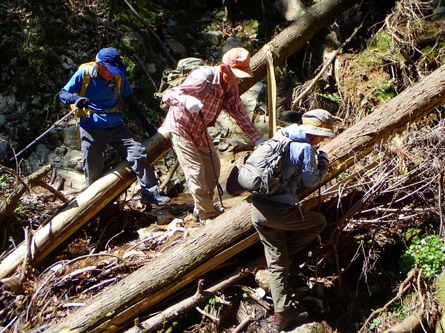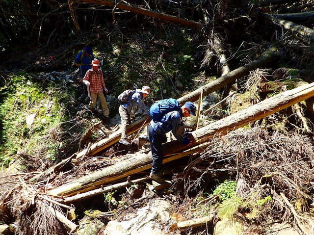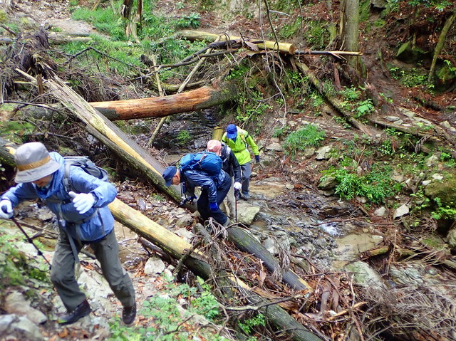 帰りも倒木をヨッコイショ!ここは雨が降ると増水して危ない
