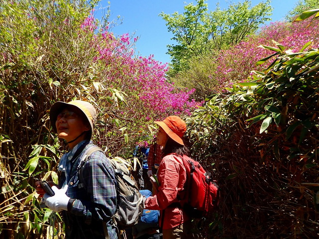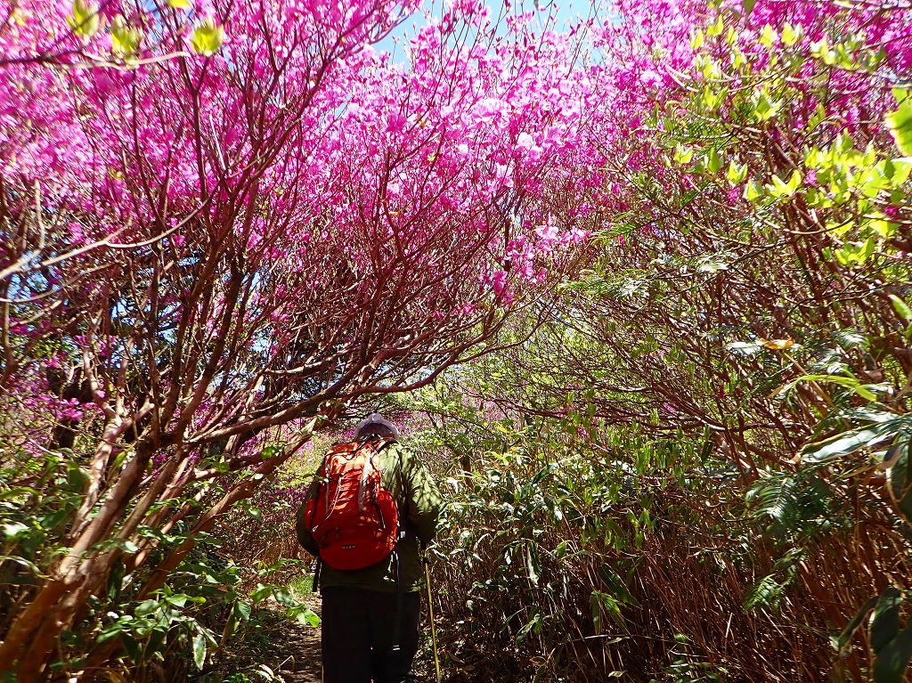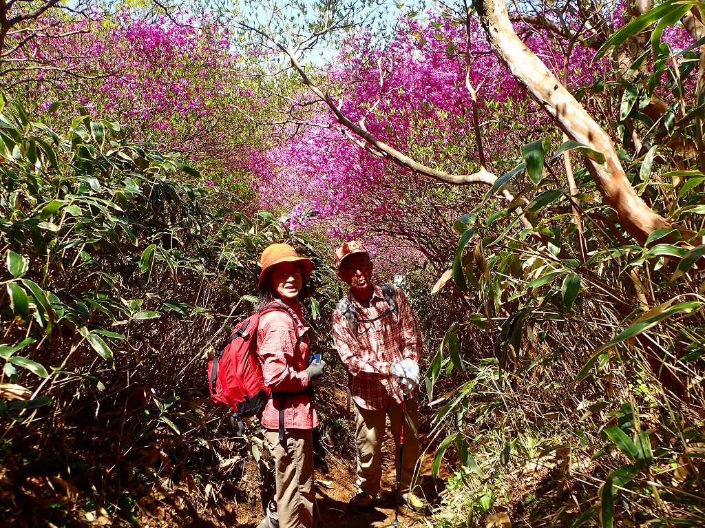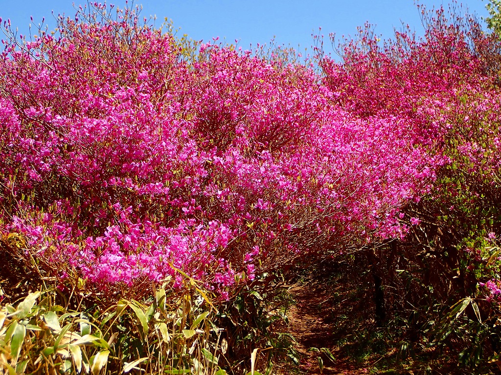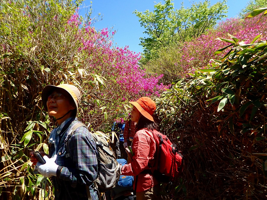 ミツバツツジのトンネルを抜け、青空のブルーとミヤコザサと新緑のグリーン、ミツバツツジのピンクと清々しい1日となりました。