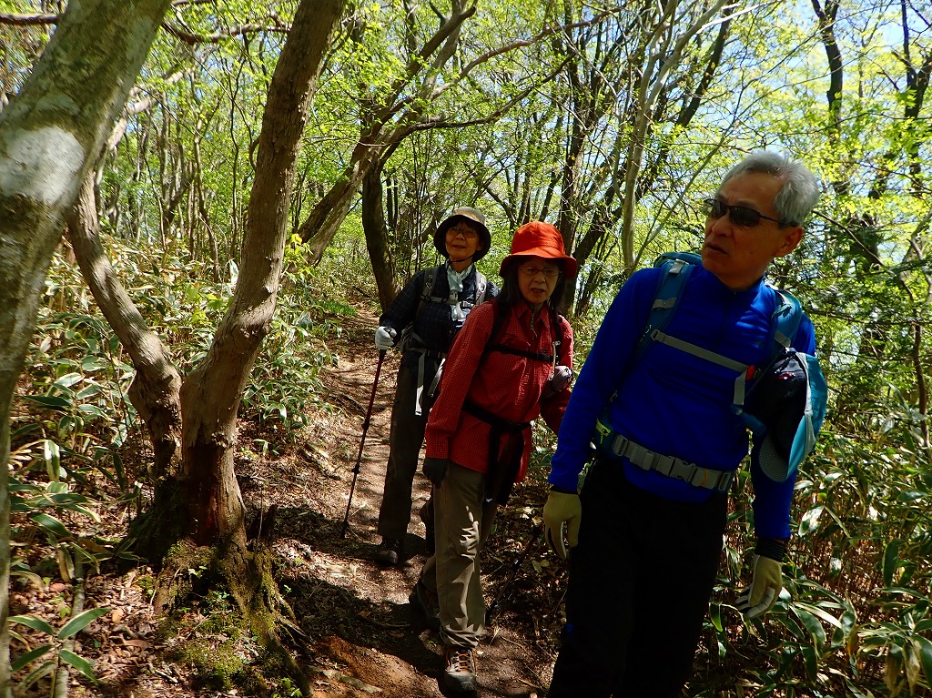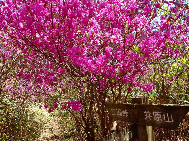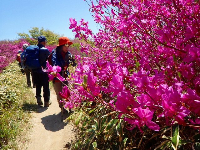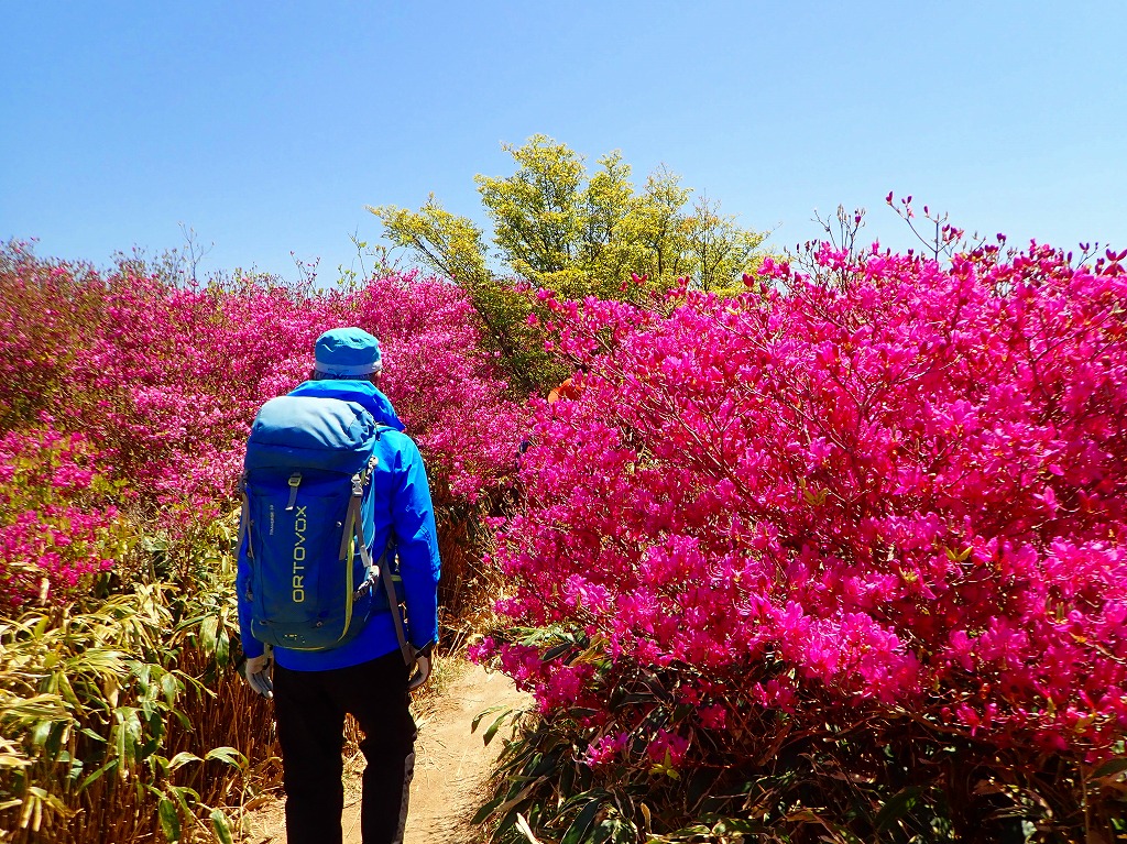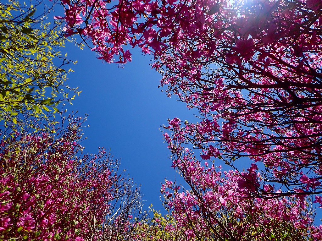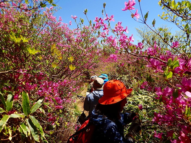 ミツバツツジのトンネルを抜け、青空のブルーとミヤコザサと新緑のグリーン、ミツバツツジのピンクと清々しい1日となりました。