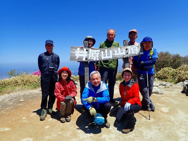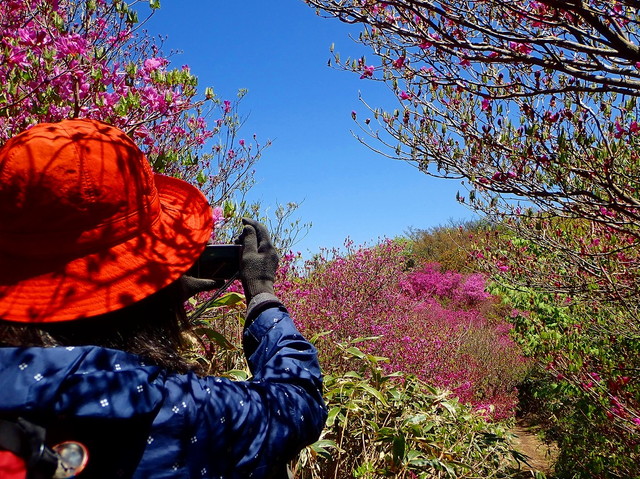縦走路の石灰岩露岩帯からぽつりぽつりとミツバツツジが現れだし中々先に進めない。山頂に近づくにつれて人も増え、あちこちから歓声が上がっている。