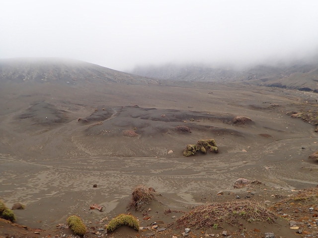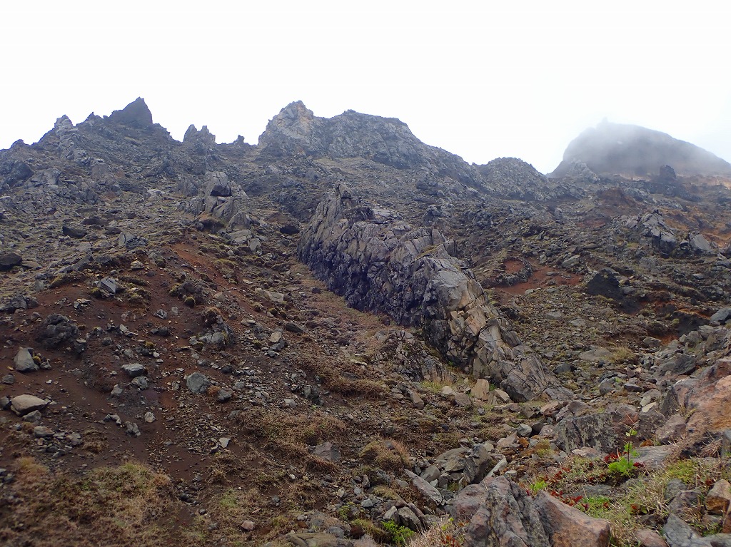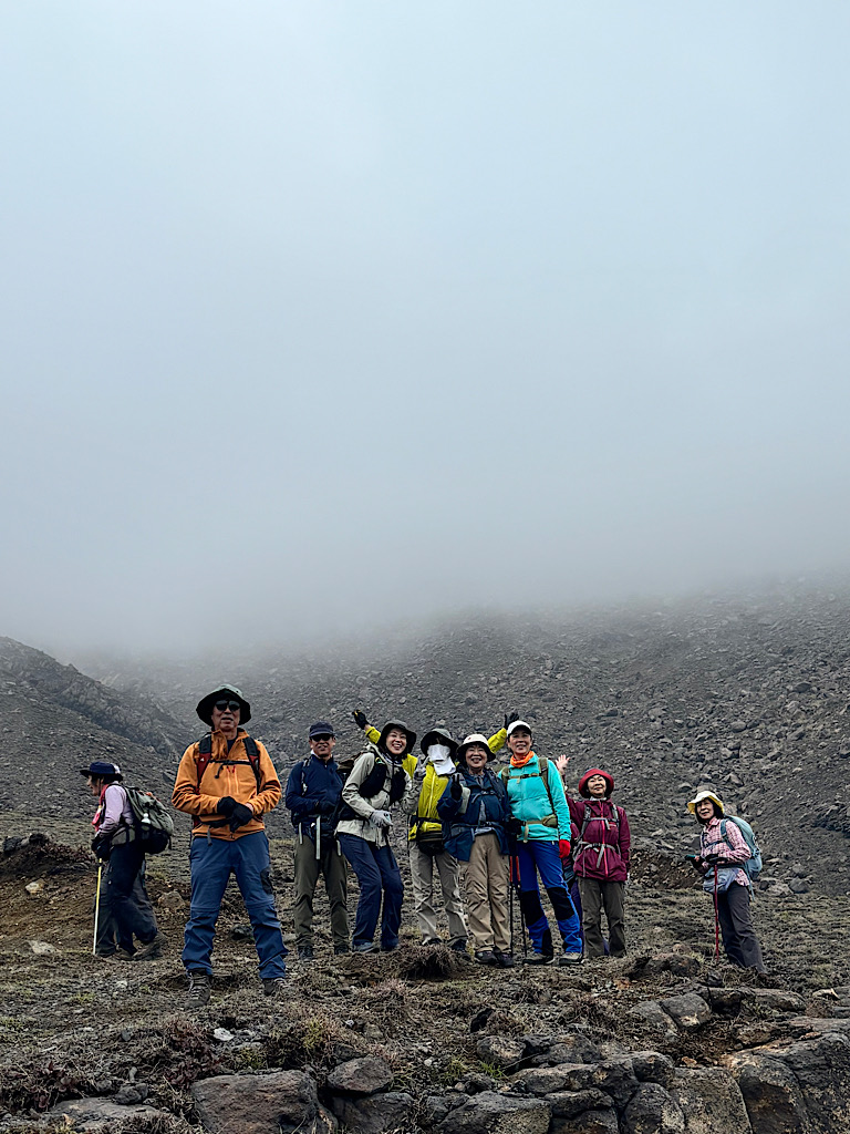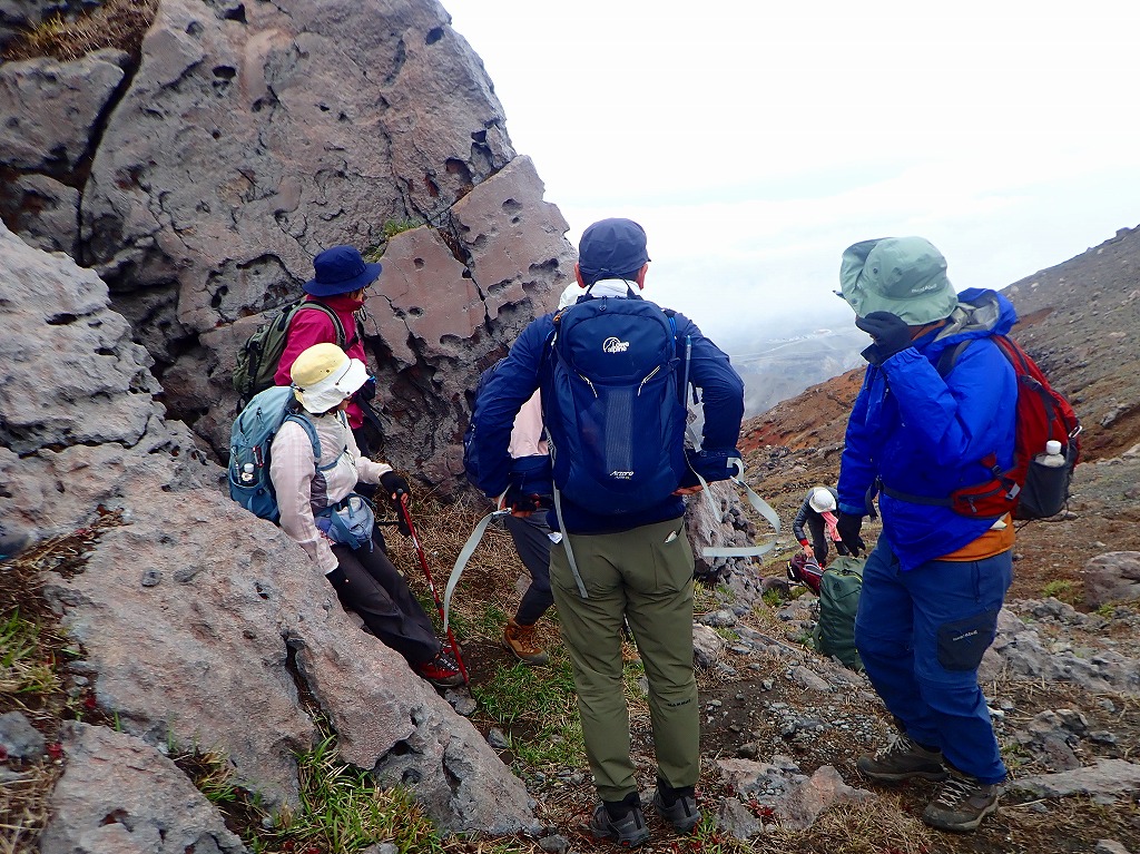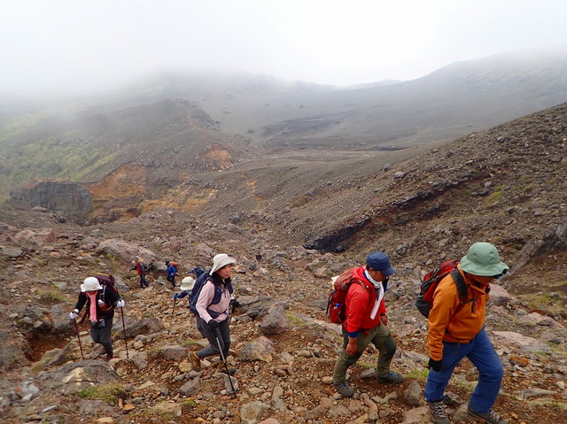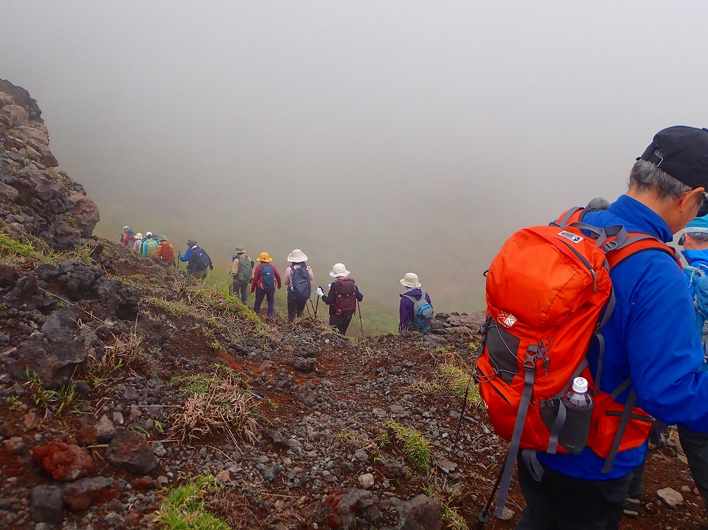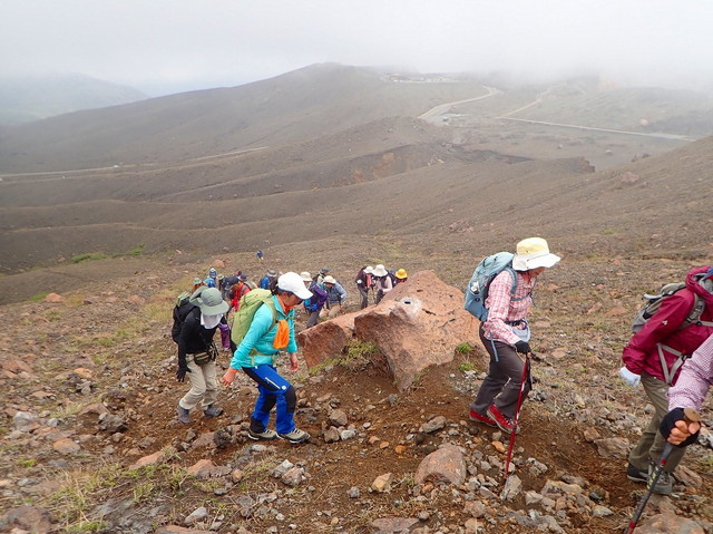 皿山に着く頃にはガスが多く、眺望は見られず残念でしたが、阿蘇火山特有の地形、砂千里を横目に南岳へと縦走。