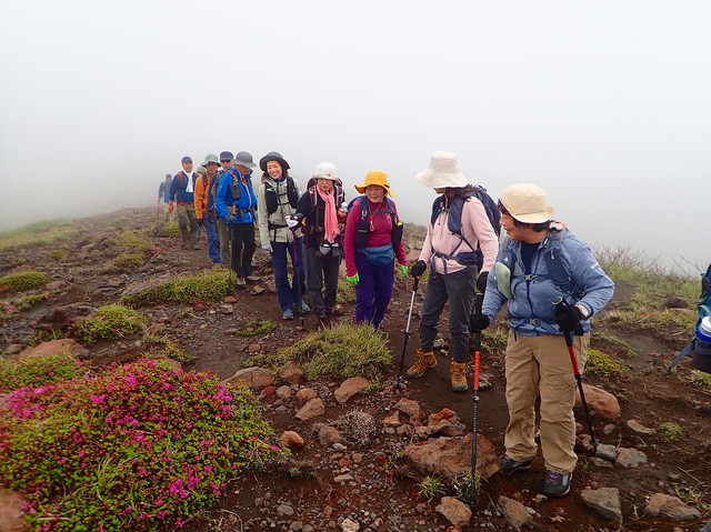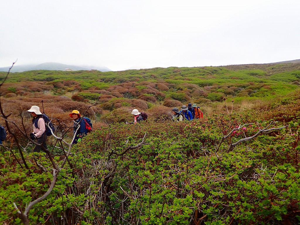 雨が心配される中、古坊中駐車場から登山開始。期待していたミヤマキリシマは、ほとんど蕾の状態。