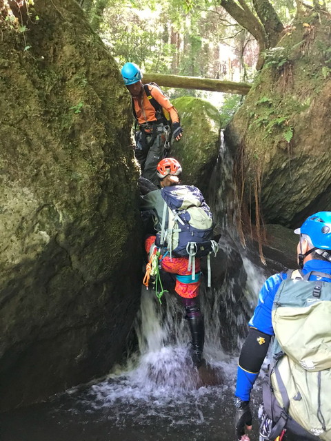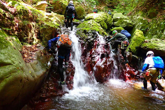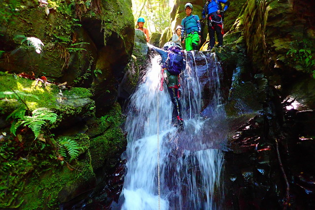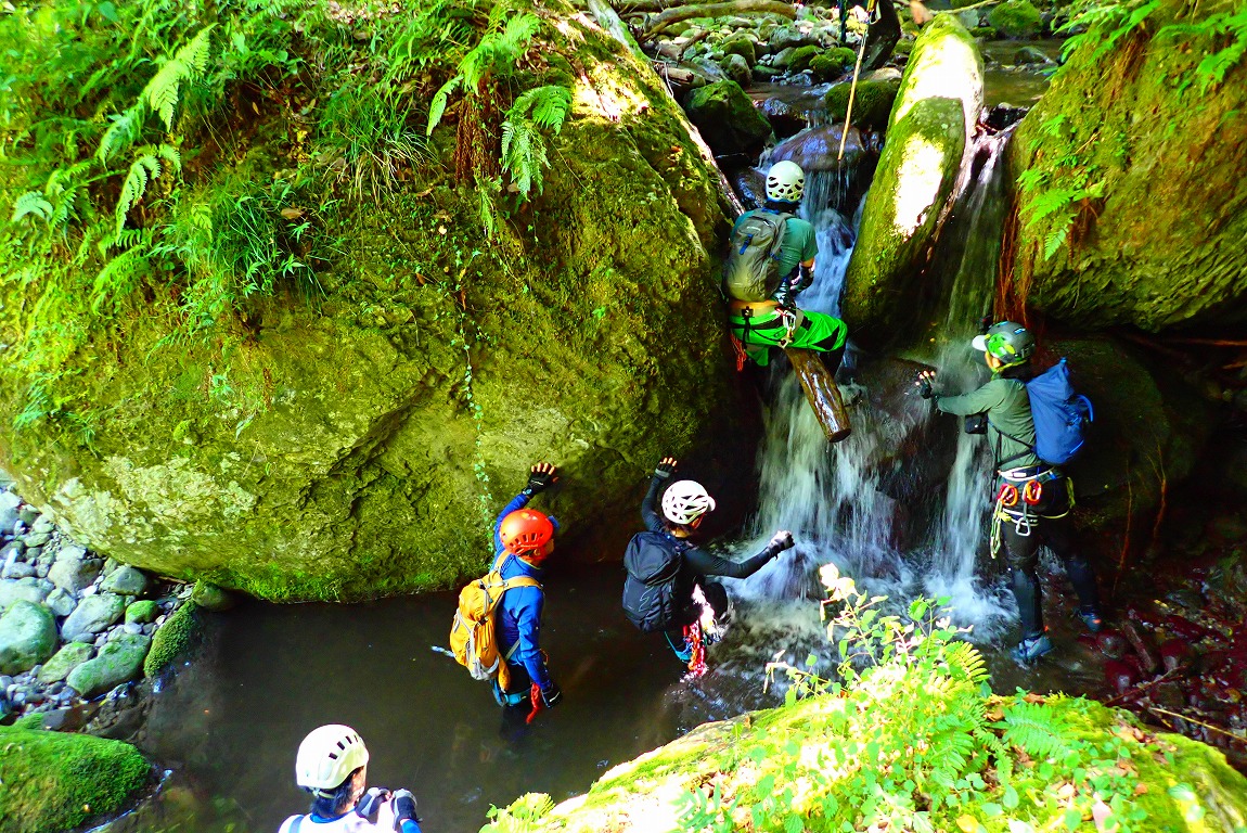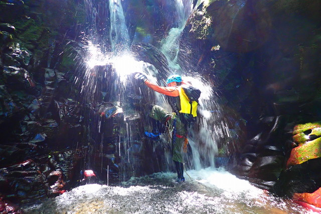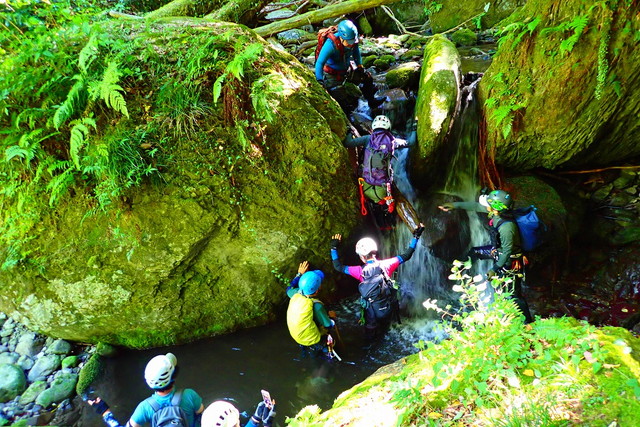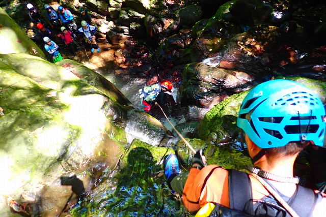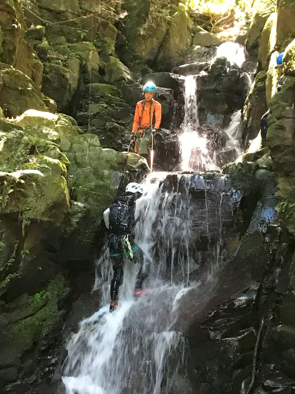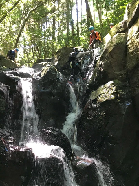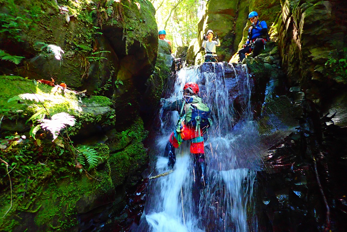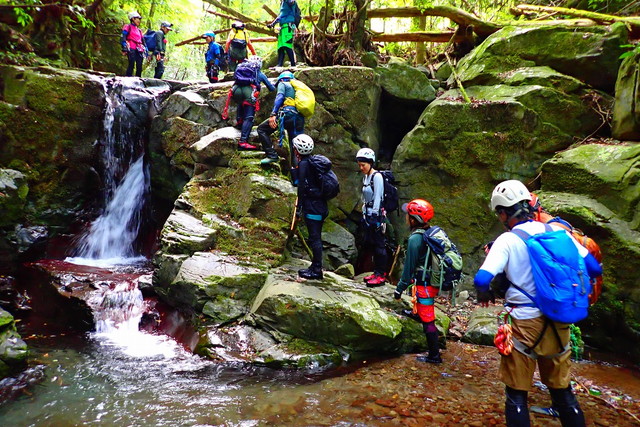 3〜4mの滝、続けて7〜8mの滝もロープを出してもらい、皆さん果敢に滝登りに挑戦し、完登しました。