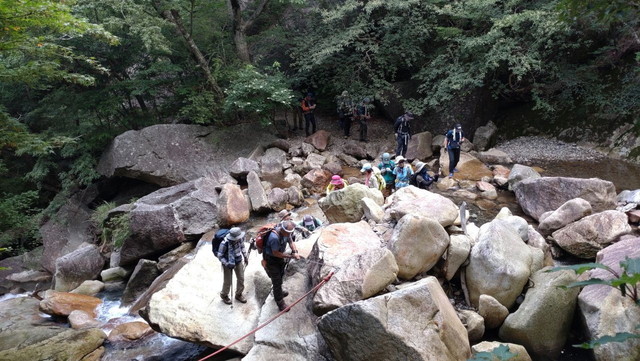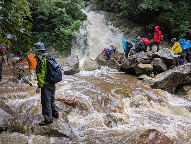 なんとかロープ場、はしご場は、下ることができましたが、渡渉箇所でトラブル発生。増水し、水も濁っていました。しかし、S原さんが、対岸で待っていてくださり、的確にサポートして下さいました。