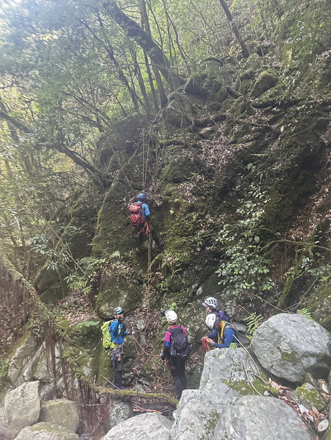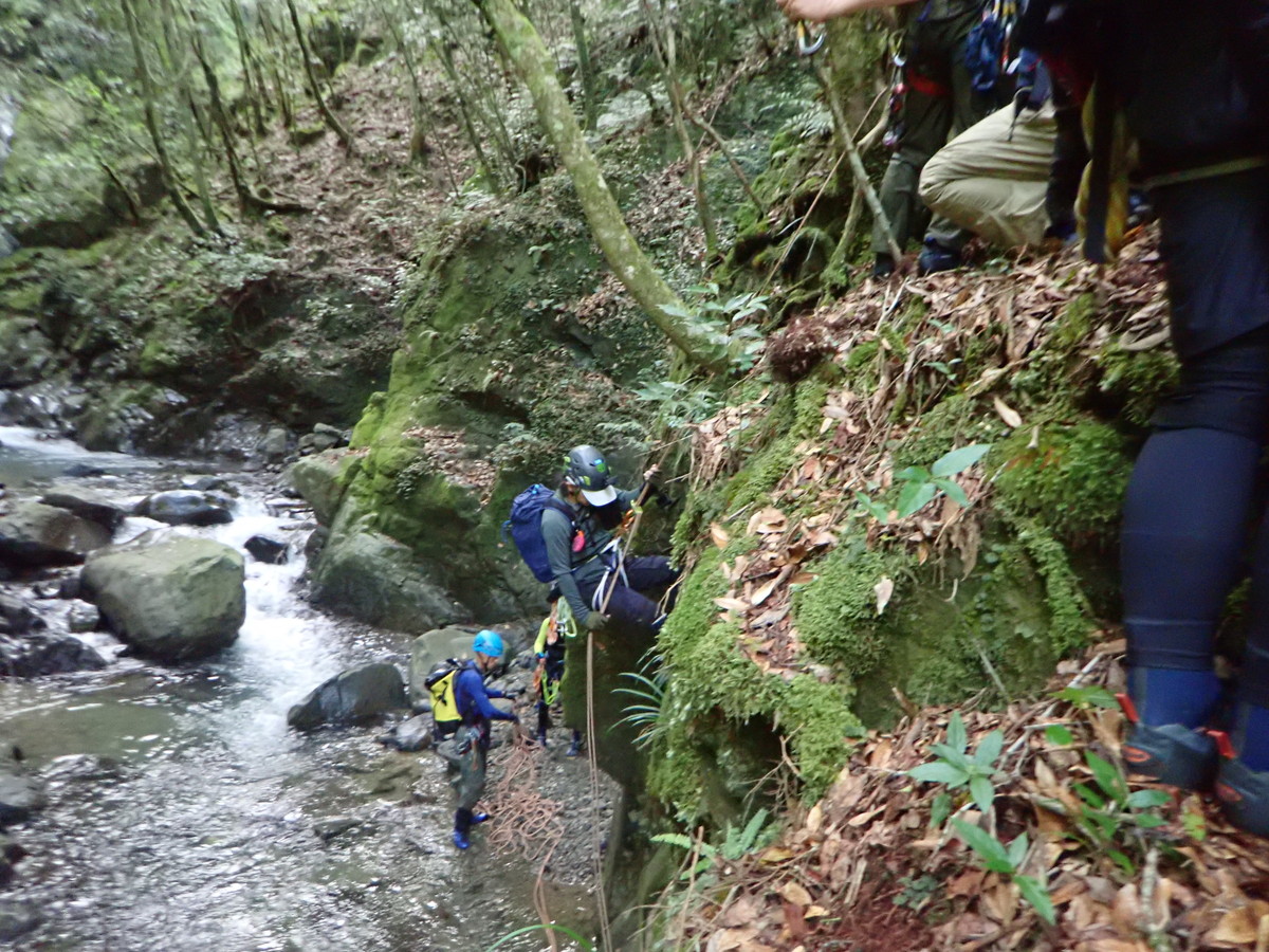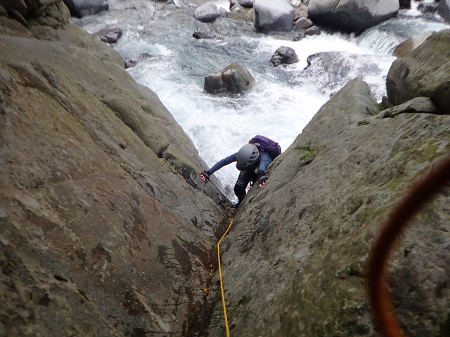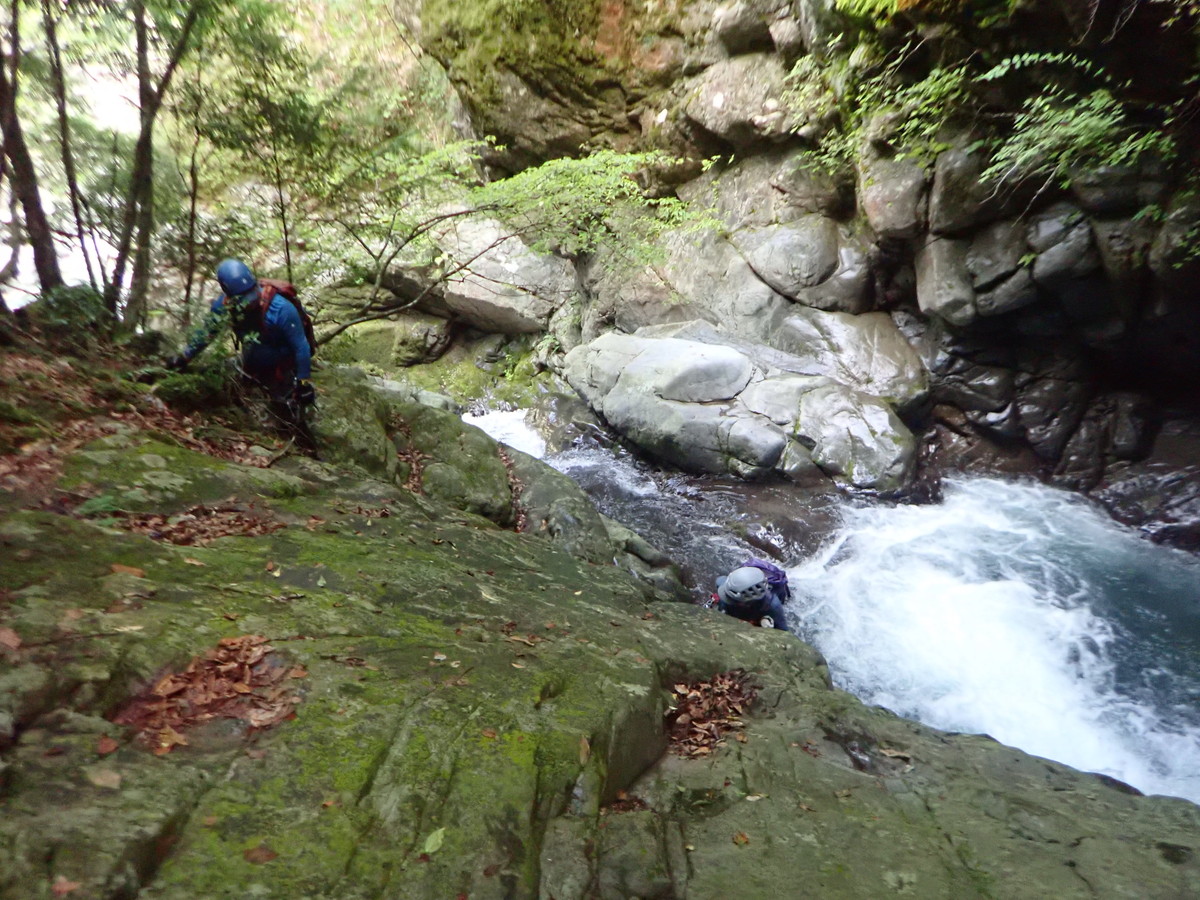 今回の反省点は中道谷の前半はゴルジュで高巻きが多く、しかもヌルヌル滑ったので短い距離でも頻繁にロープを出して慎重に確保しながら行ったほうが良かったという所でした。