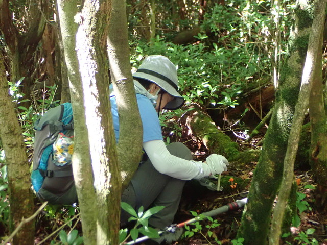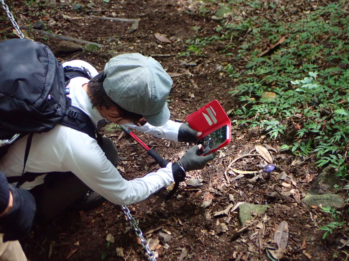 アカヤマタケを激写中のウッチさん
