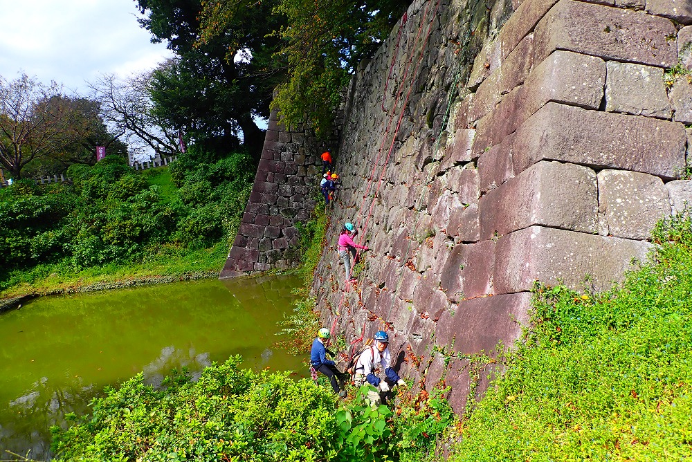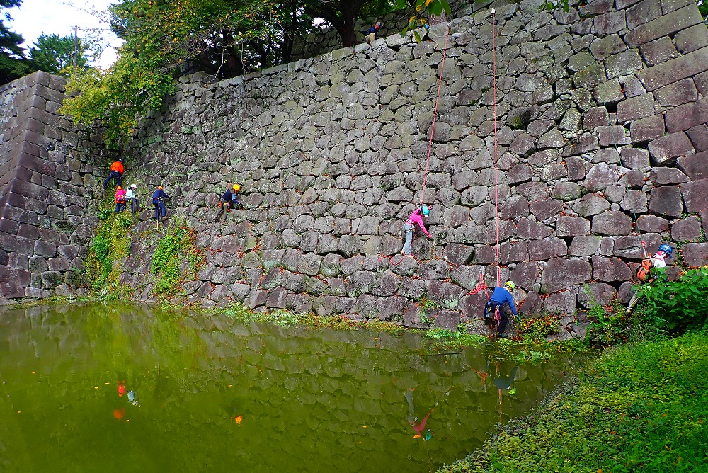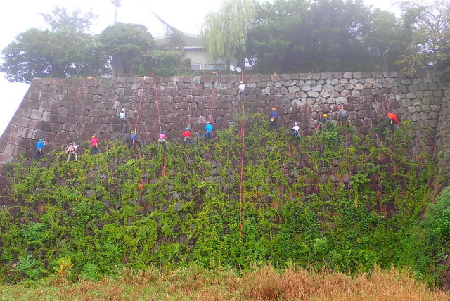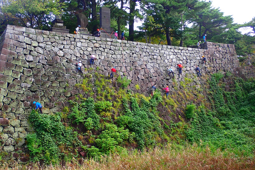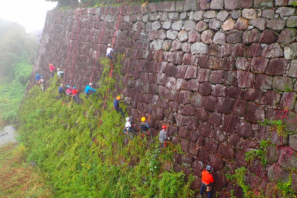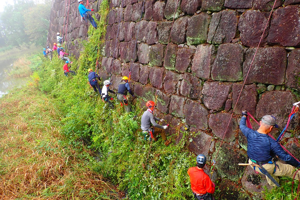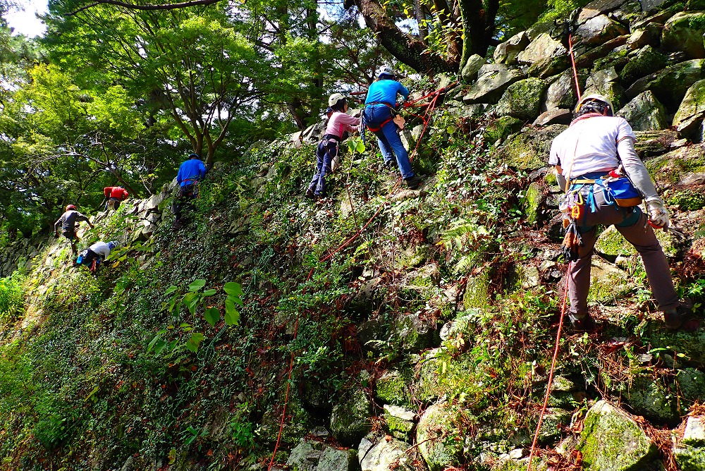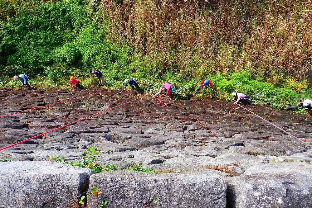 皆さん石垣にロープを下して、石垣に絡みついたツルやツタの雑草を剪定ばさみ除草したり落葉を取り除きました。