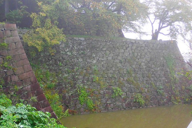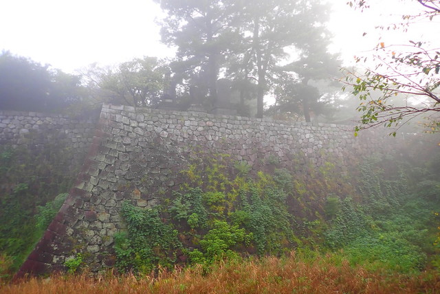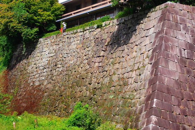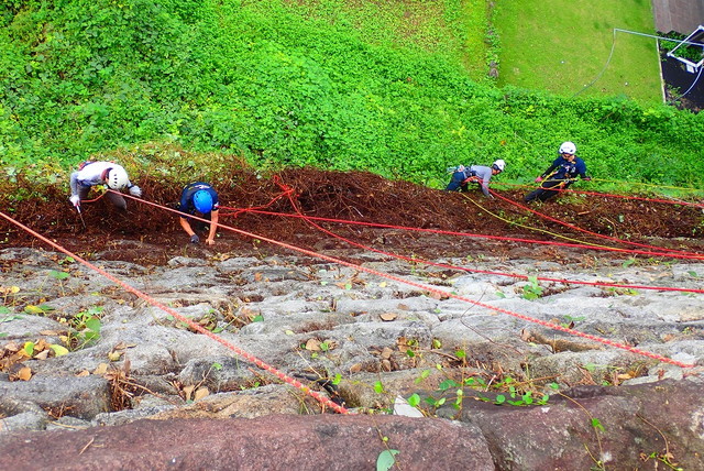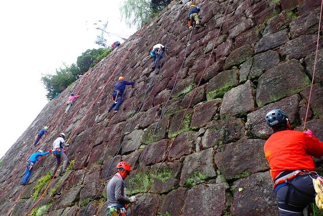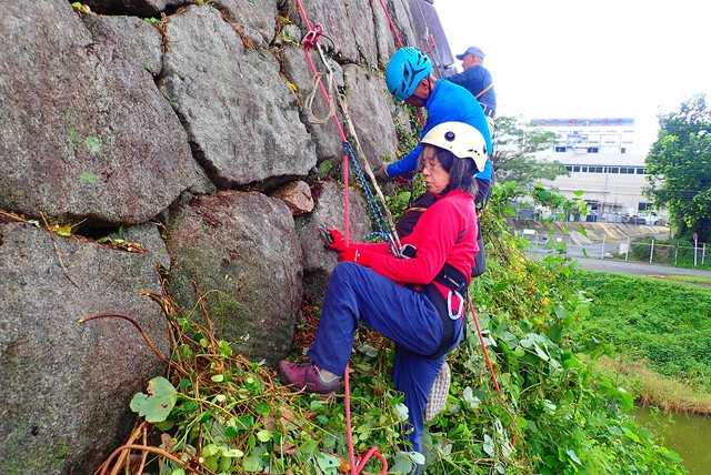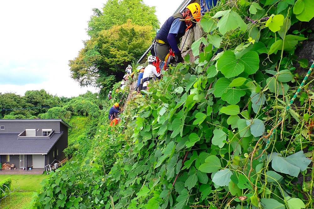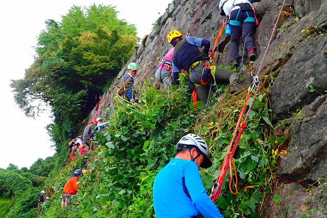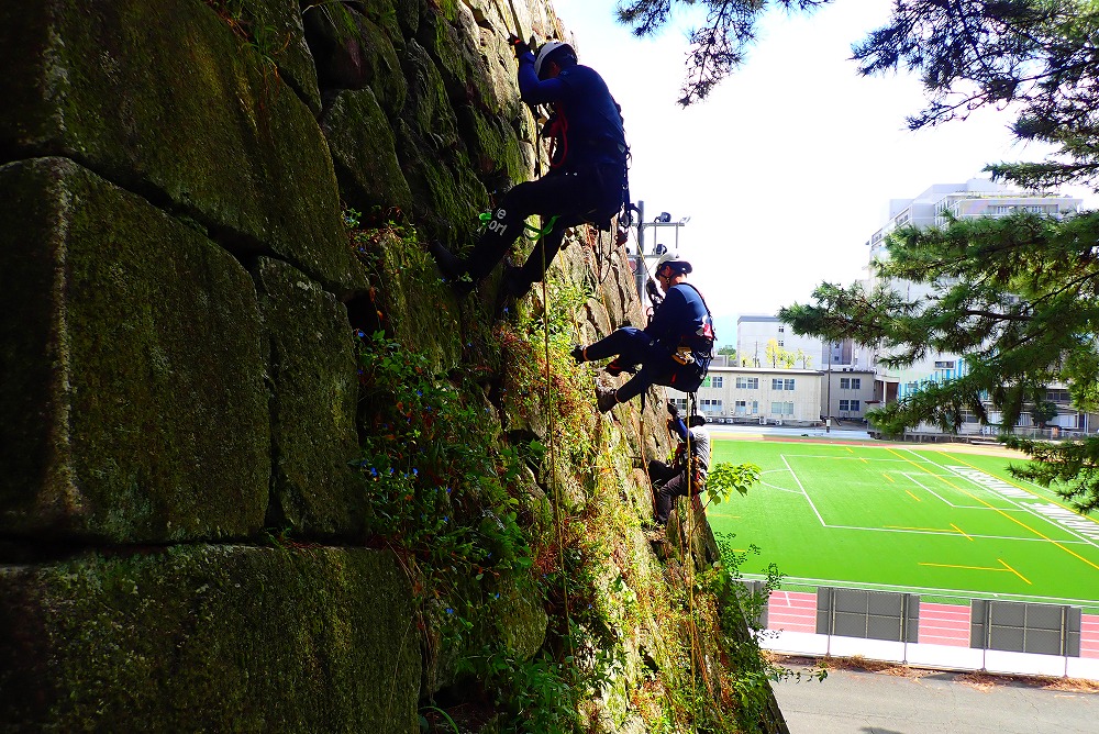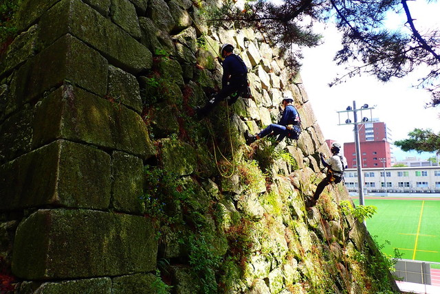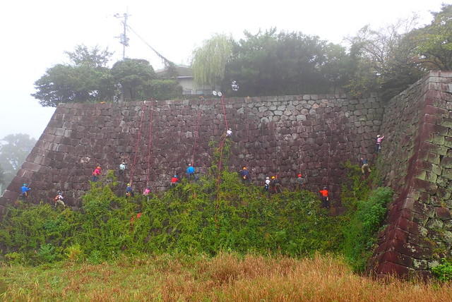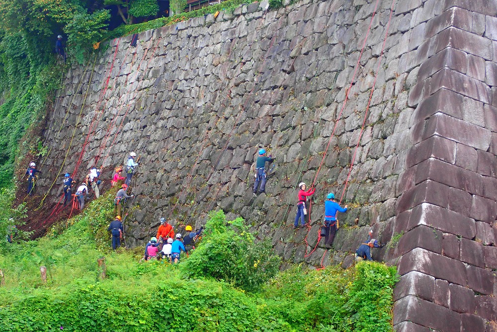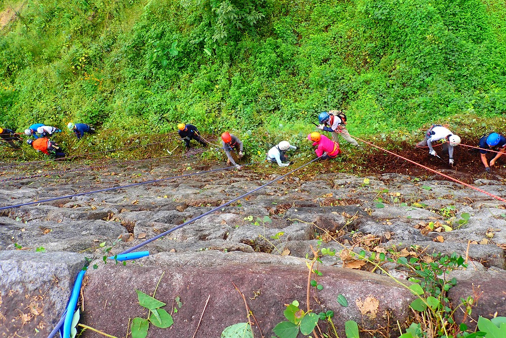 皆さん石垣にロープを下して、石垣に絡みついたツルやツタの雑草を剪定ばさみ除草したり落葉を取り除きました。
