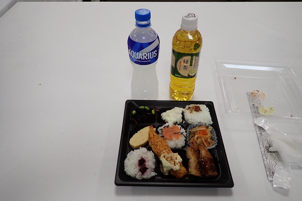神社の厚意により弁当とお茶を準備していただきました。アクエリアスは九電工様から差し入れをいただきました。