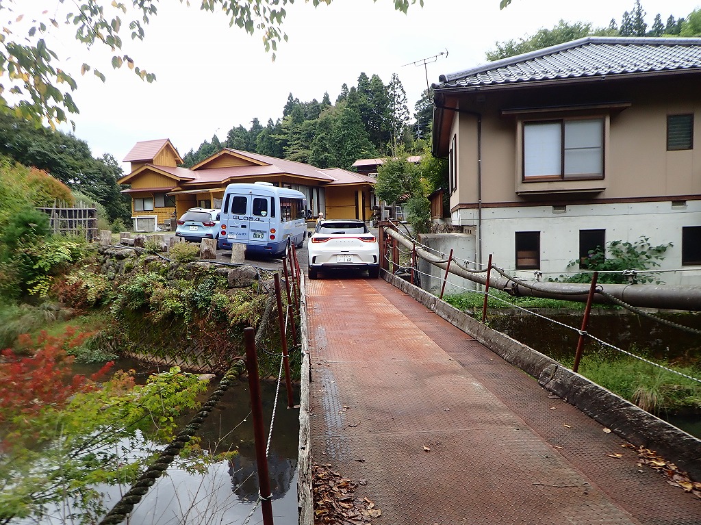 ひぜん湯到着!バスが待っていますが、橋の幅ギリギリで車が通ってビックリ(*_*;