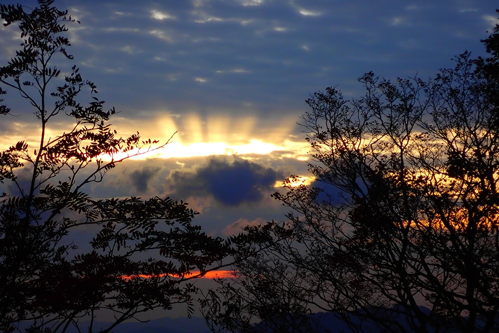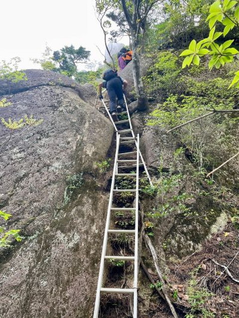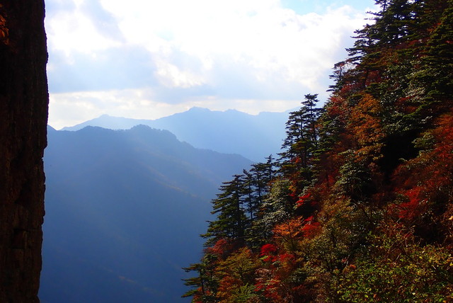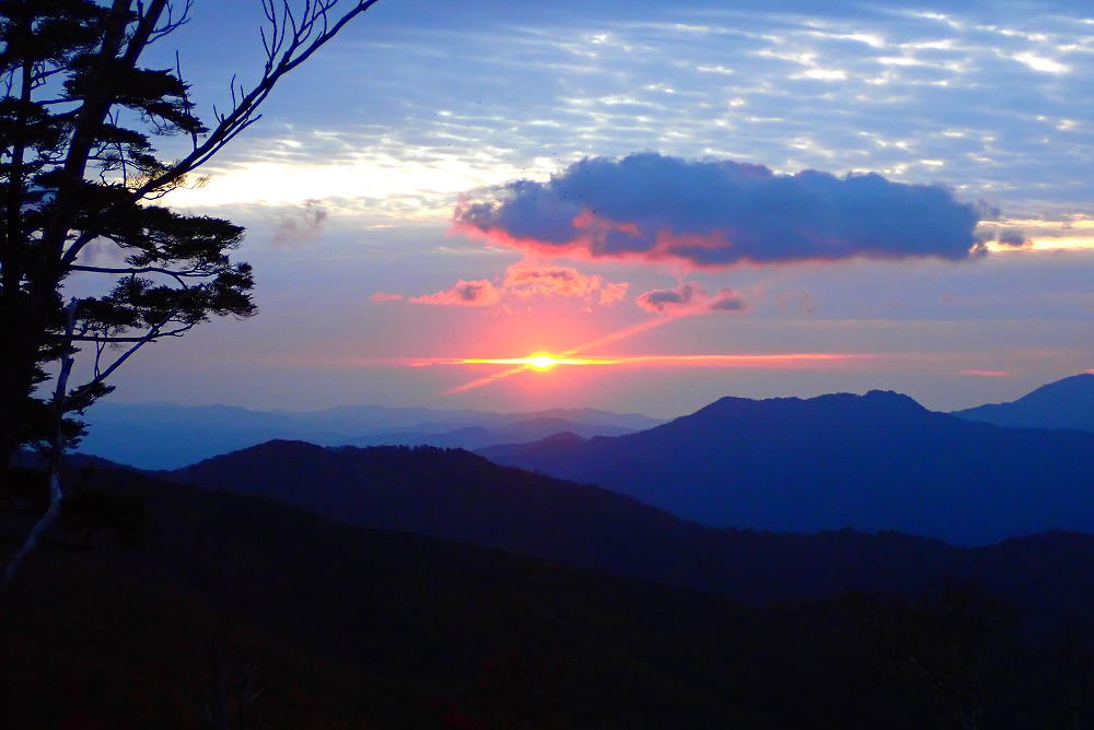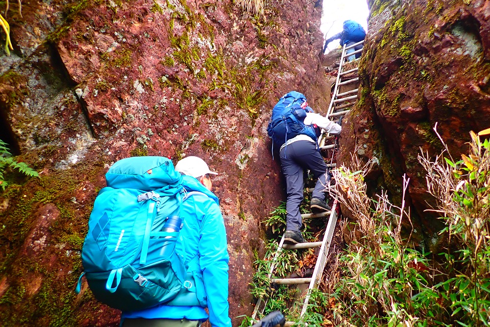 ・2日目:5時30分、九折小屋出発し、本谷山に8時18分到着、古祖母山に11時50分、障子岳に13時16分、祖母山に15時12分、九合目小屋に16時に到着。九合目小屋には他に4グループほど泊まっていました。この2日目は一番長い行程で、アップダウンが続き、はしご、ロープの連続でした。歩行距離15.7q・時間10時間40分