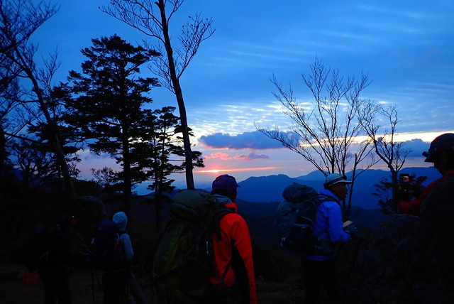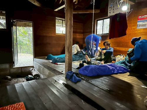 ・1日目:5時、久留米百年公園を出発し、九折登山口に8時10分ごろ到着。歩行距離8.3q・時間(休憩含む)7時間50分。観音滝を過ぎると急登が続くかなりハードなコースです。傾山頂に15時到着、九折小屋に16時56分到着。小屋には別グループの方もいました。テント場にも一張張ってありました。