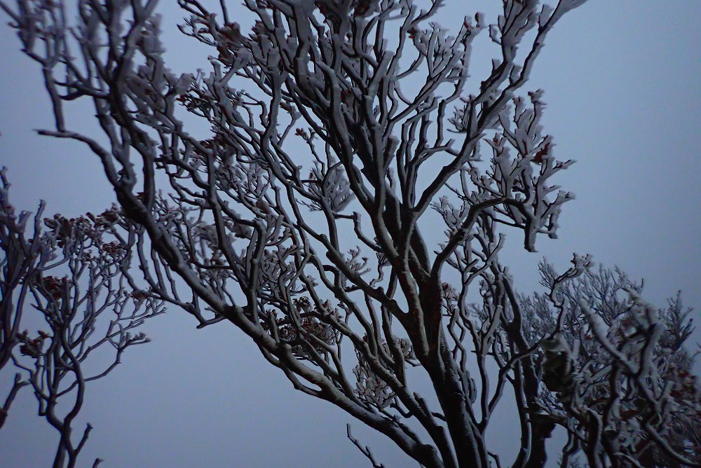 ・3日目:九合目小屋を予定通り出発したのですが、ガスって、冷たい強風が吹き、出始めのルートを誤り、北谷登山口の方に向かってしまいました。1時間ほど時間ロスしましたが、霧氷(樹氷)を見ることができました。7時仕切り直して、九合目小屋再出発、大障子岩に10時10分、前障子岩に12時26分、上畑登山口(健男社)に14時58分到着。歩行距離11q・時間8時間。車で初日停めた九折登山口駐車場へ。久留米百年公園に19時ごろ無事に帰着しました。