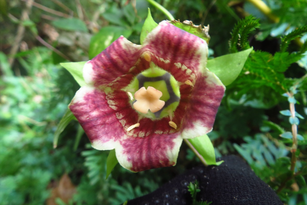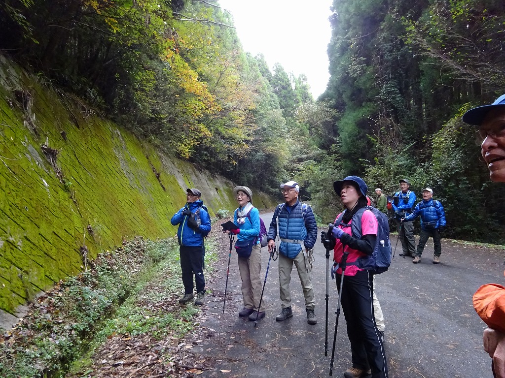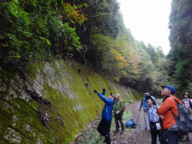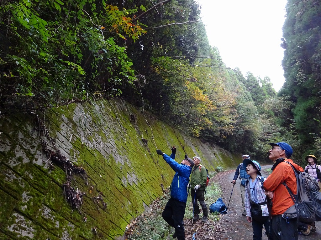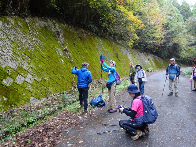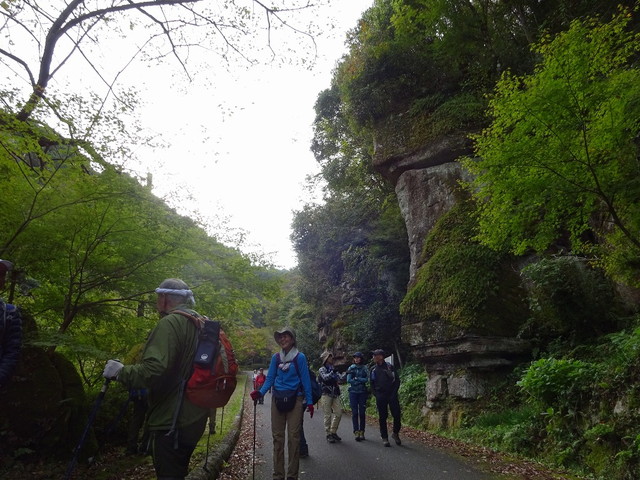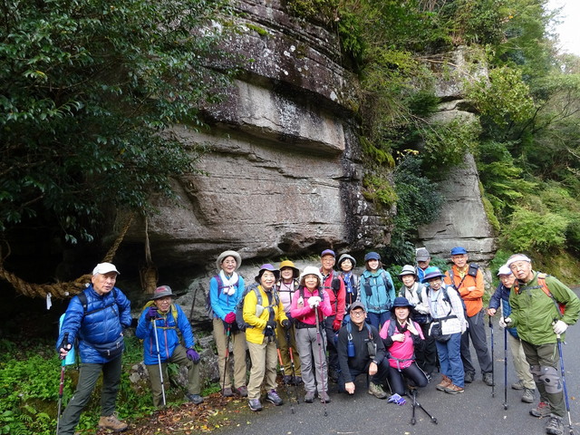 渓谷の重箱岩の前での集合写真、この対岸はまさに渓谷、そろそろ見頃ですのでお出かけください。さて先は長い、これからだという時に、なんと目の前にアケビが吊り下がっているではないですか、先を急ぐはずなのにロープを出して・・・