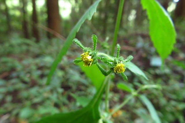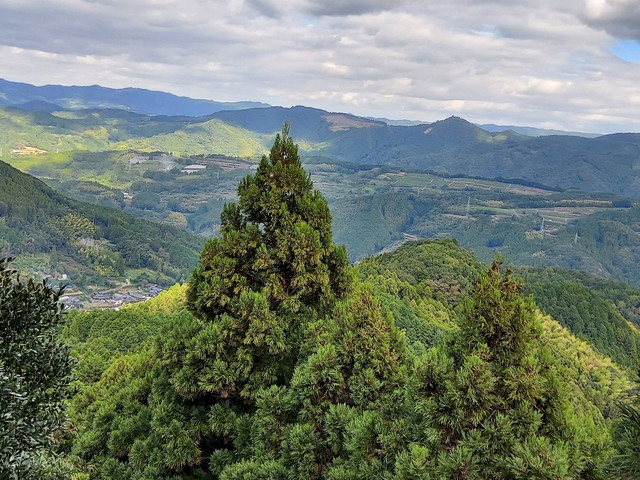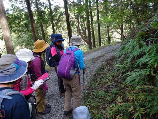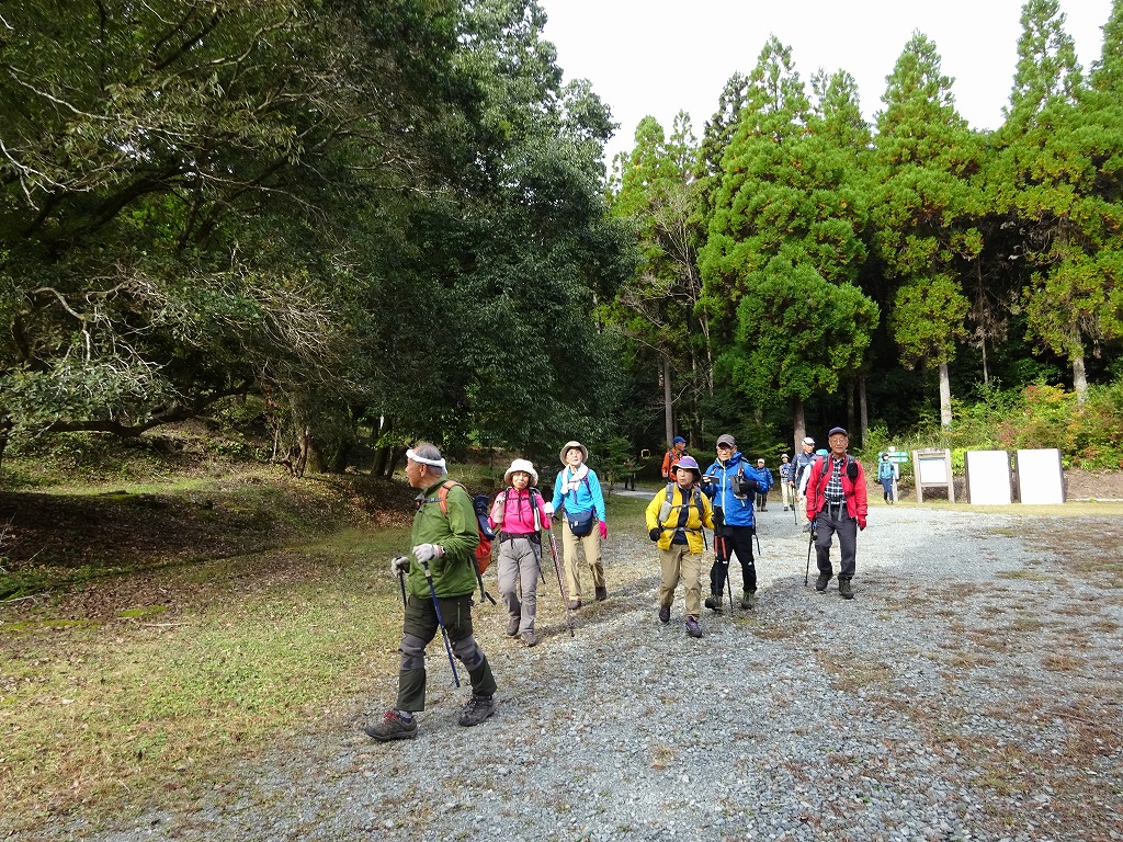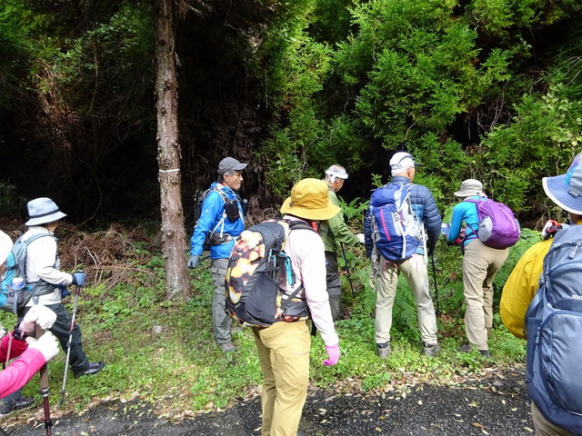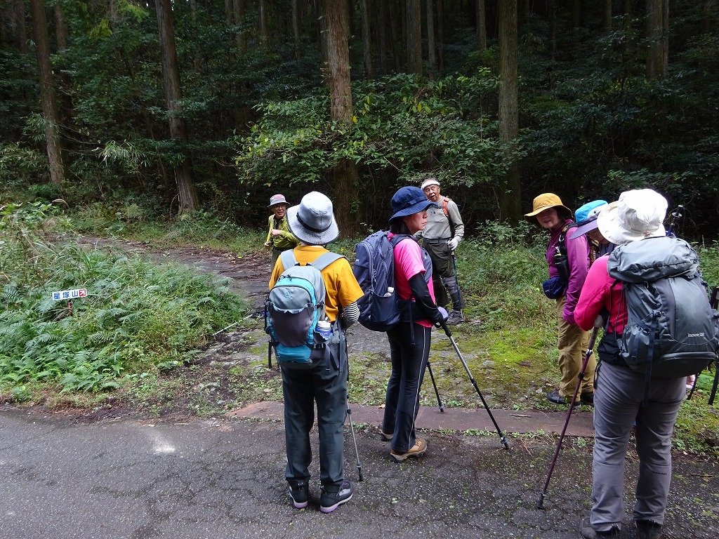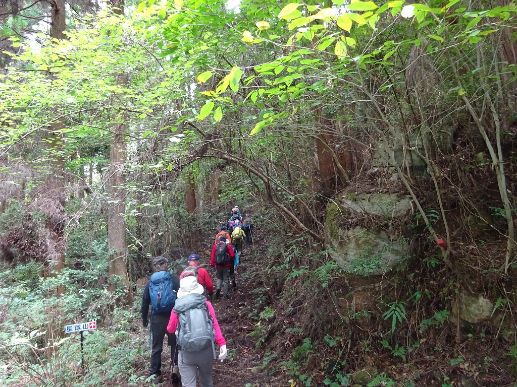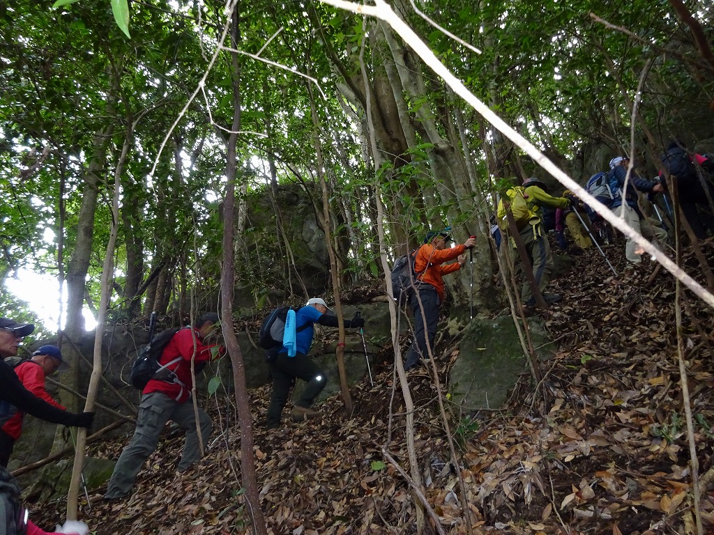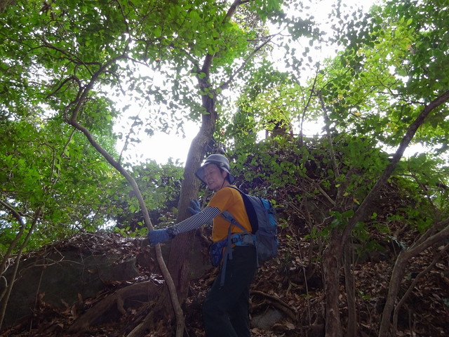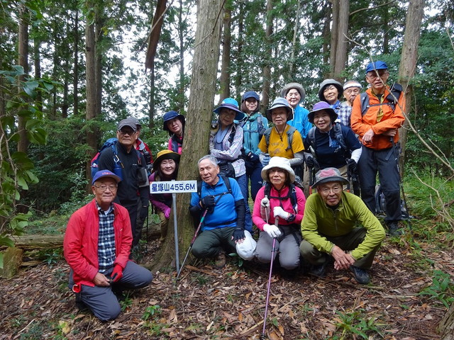 頂上での集合写真、木々に囲まれ眺望無し・・・。だがしかし、途中の巨岩の上からは一気の眺望があるとのことで、なぜか岩から降りたばかりの人を